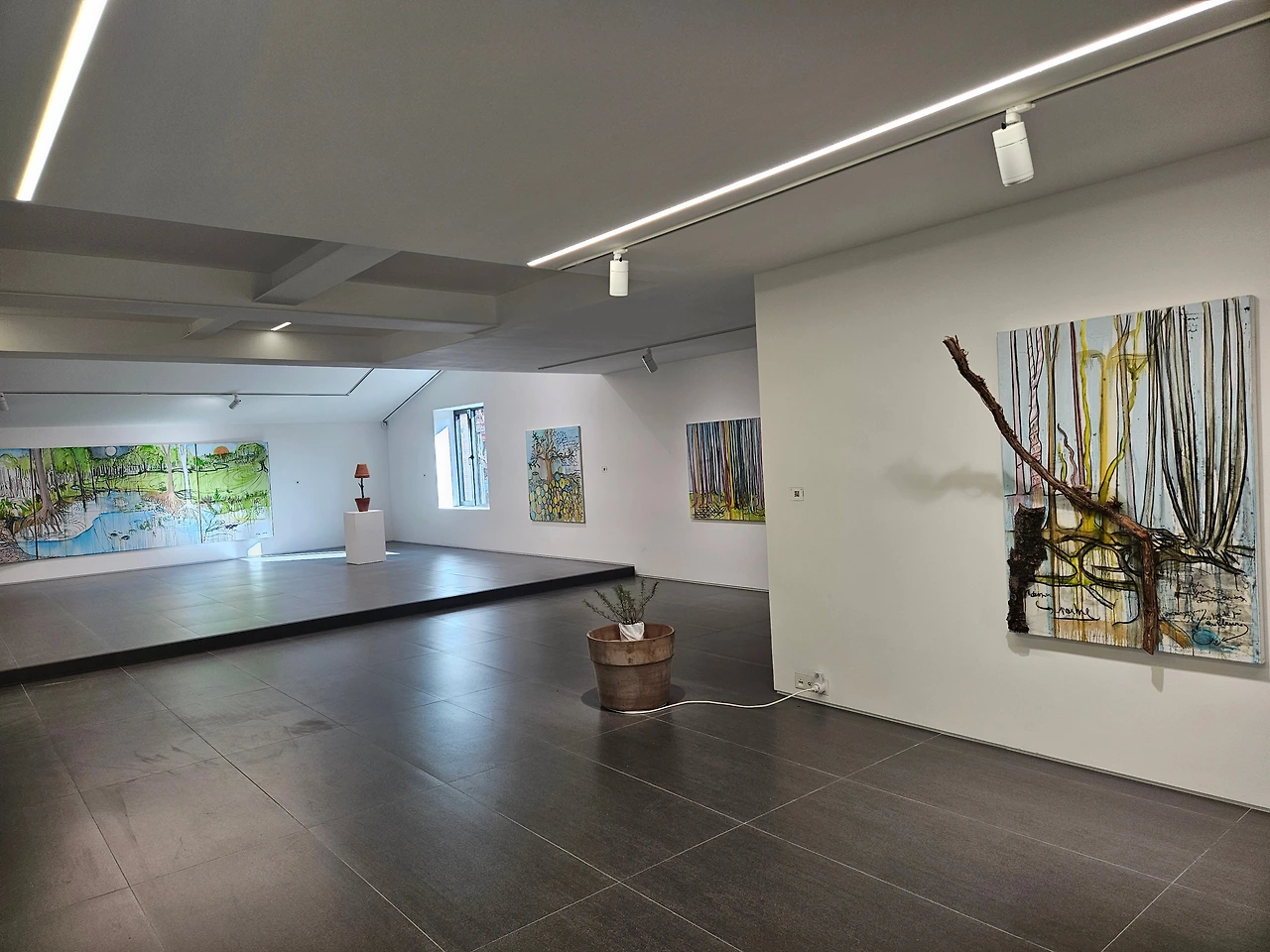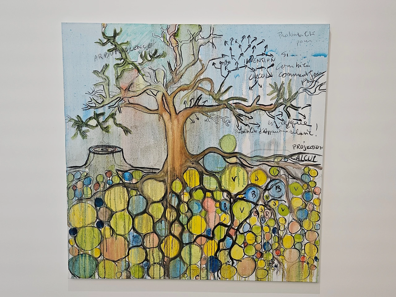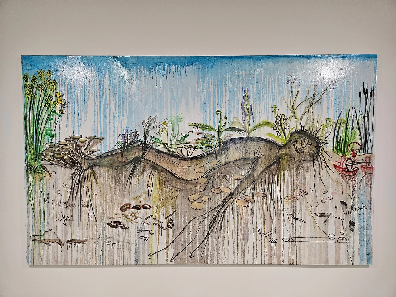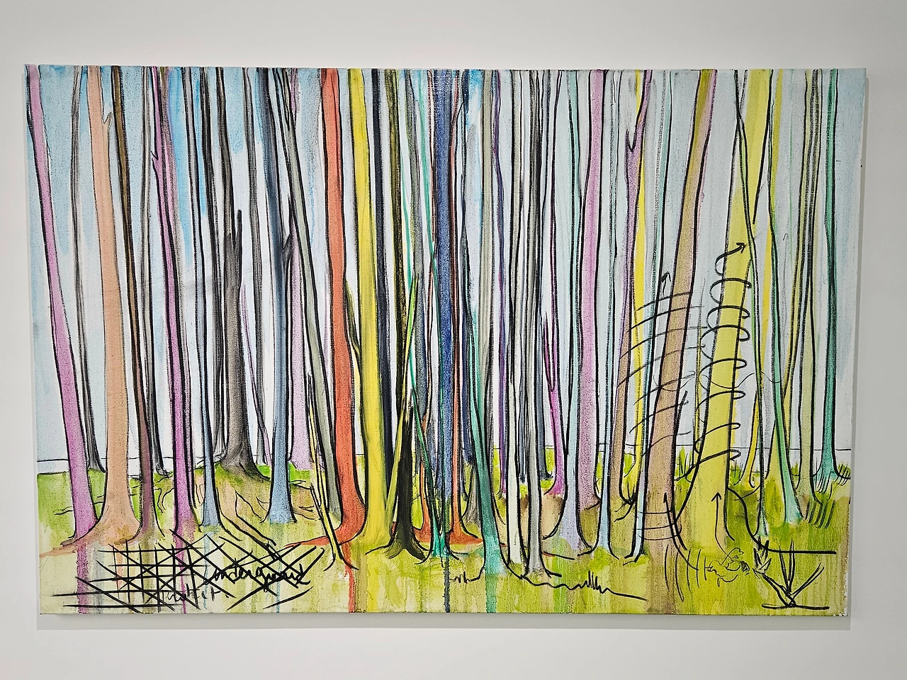 미술관 밖은 겨울이지만 전시실은 온실에 들어온 듯 온통 나무와 숲이 우거진 풍경화가 펼쳐지고 있었다. 가까이 다가가니 여느 풍경화와 사뭇 다르다. 생물 교과서를 보듯 땅 속에 있는 나무뿌리와 암반, 지하수는 물론 물과 자연의 순환과정을 도식화한 표식까지 보인다. 작가는 사계절 움트는 자연의 생명력과 생태계의 가치를 대형 캔버스에 생태학자의 연구노트처럼 표현했다. 서툰 한국어로 쓴 '두더지', '풍경을 쓰다'라는 문구로 발견할 수 있다.