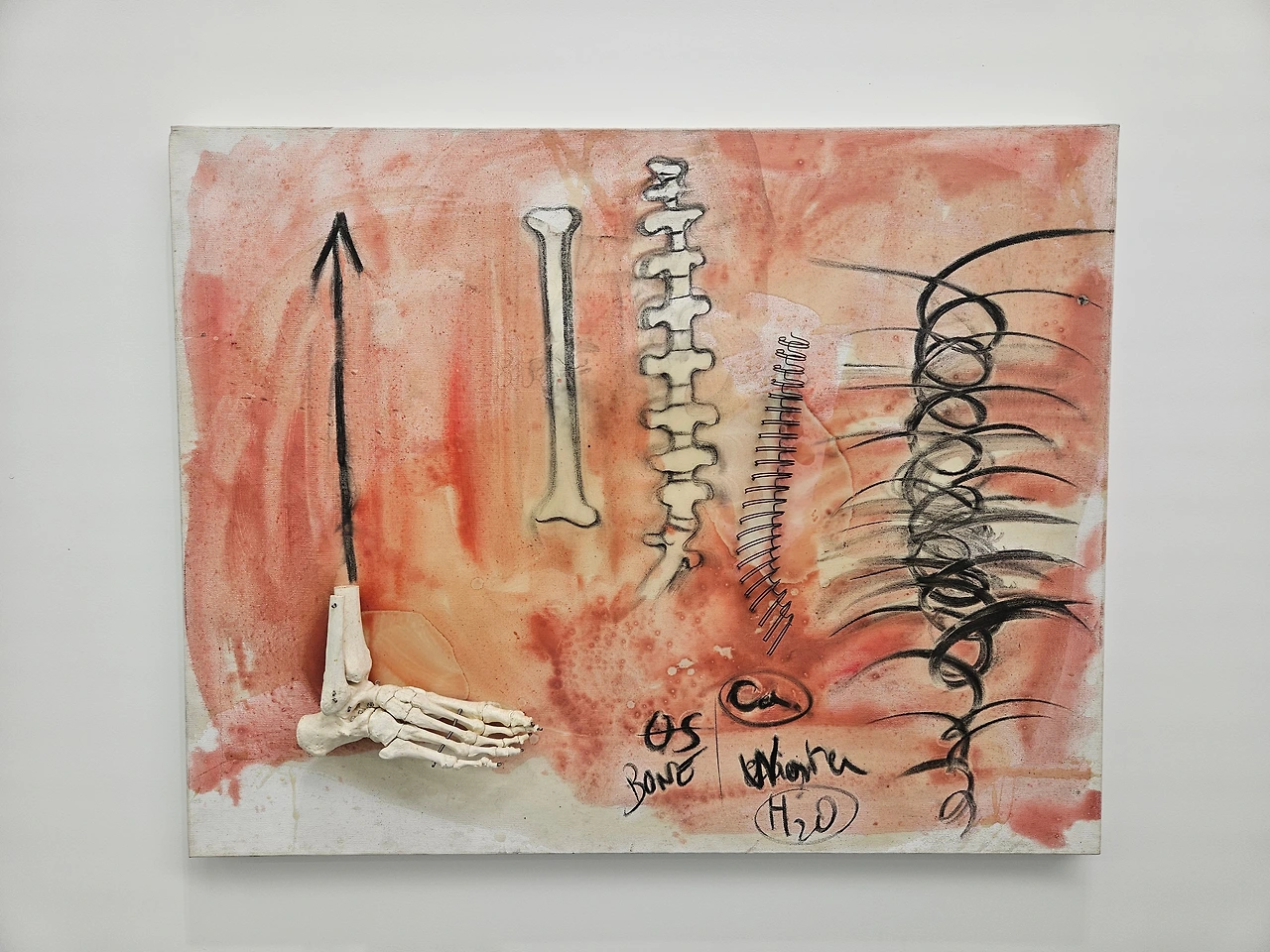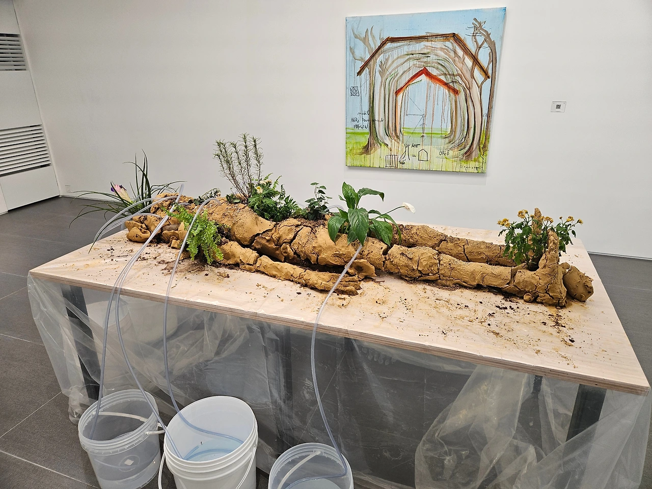 평면화뿐 아니라 나무줄기와 껍질, 인체 모형 등의 오브제를 캔버스에 접목한 작품들도 보인다. 특히 수술대 위에 누워 치료받는 듯한 인간의 몸은 흙으로 빚었다. 인간의 몸에 연결된 여러 개의 호스가 양동이의 물과 연결되어 몸 위로 식물들이 자라고 있다. 바싹 마른 흙이 양분을 섭취해 촉촉하게 되살아나 온몸에 식물이 돋아난 새로운 생태형 인간이 되어 일어날 것 같다.