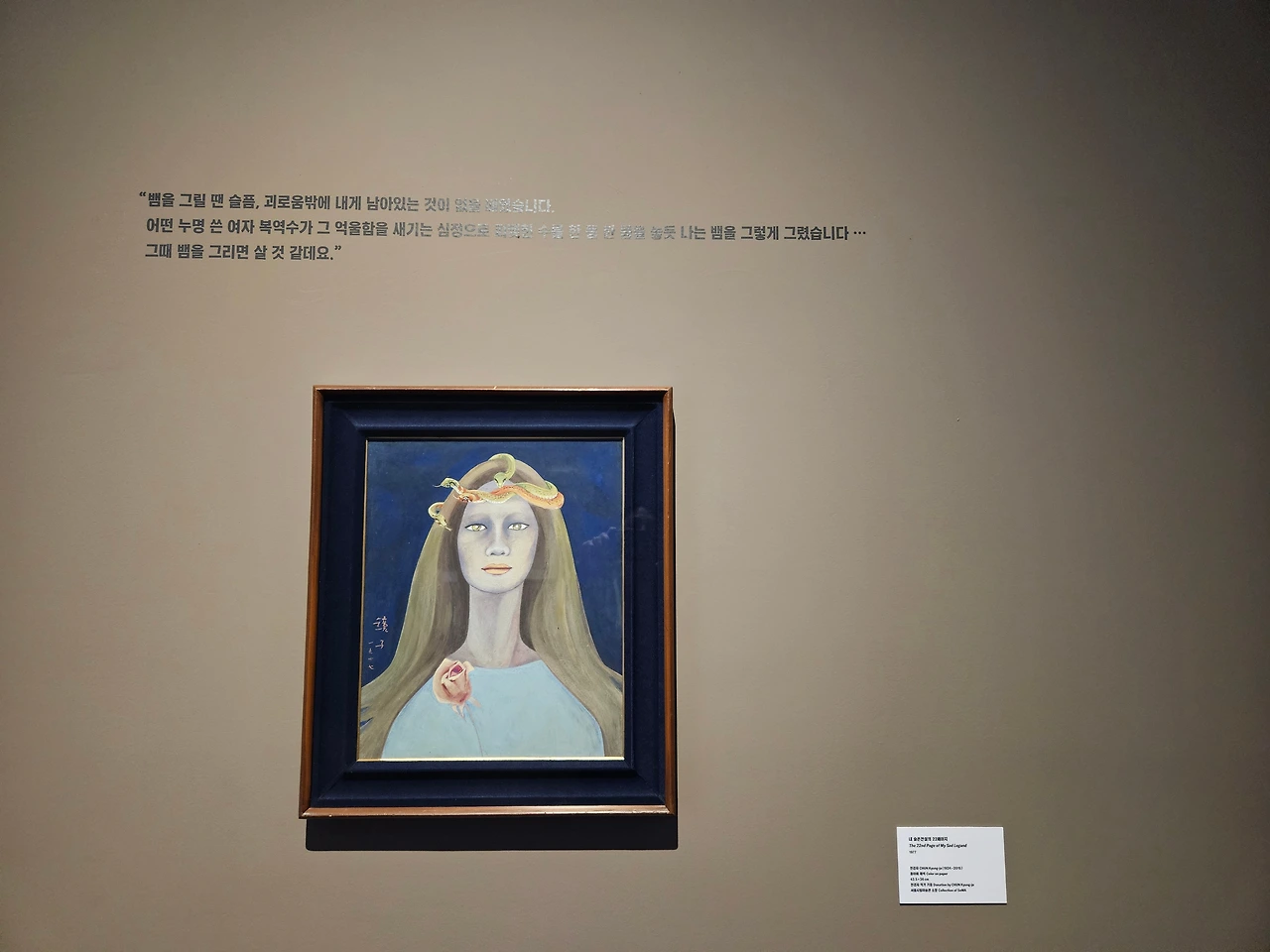 계단을 따라 2층으로 왼편으로 진입하면 미술관의 유일한 상설전시관인 천경자 화백의 전시실과 ‘가나아트 컬렉션’실이 있다. 화려한 색채와 신비스러운 분위기를 표출해 독창적 화풍을 개척한 천화백은 작품 속에서 항상 꽃과 여인을 등장시켰다. 그 중 작가를 '화단의 스타'로 등극시킨 1952년작 <생태>에서 시선을 떼기가 어렵다. 35마리의 뱀이 엉켜있는 모습이 담긴 이 그림은 화백이 인생에서 가장 힘든 시기에 완성한 그림이자 가장 아끼는 작품이었다.