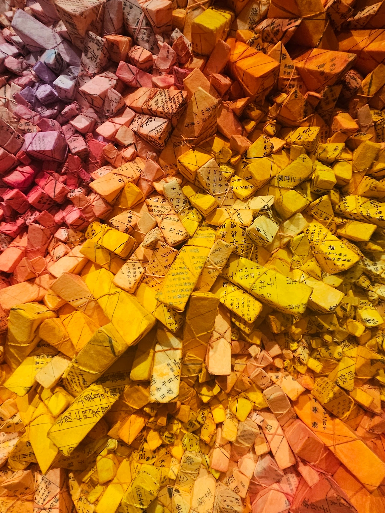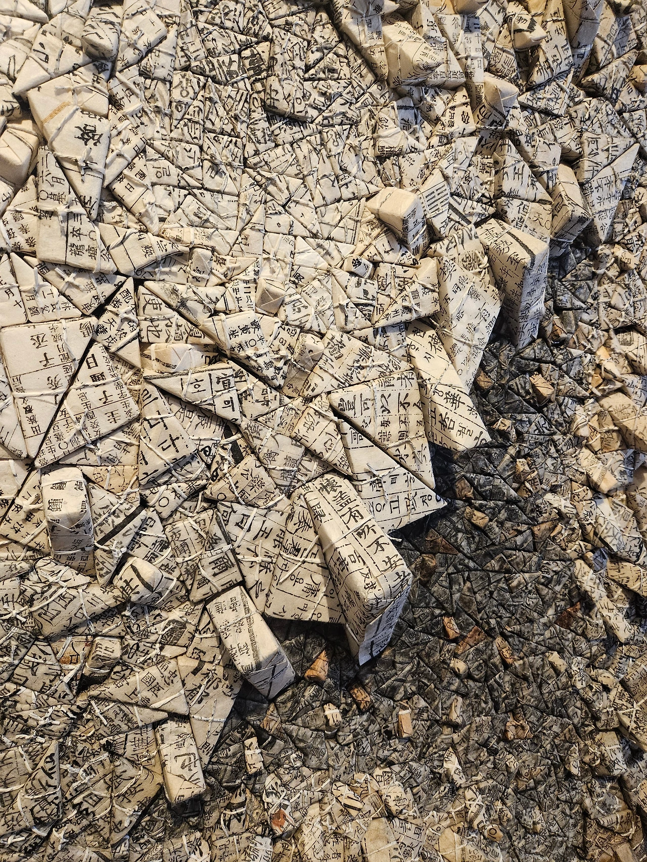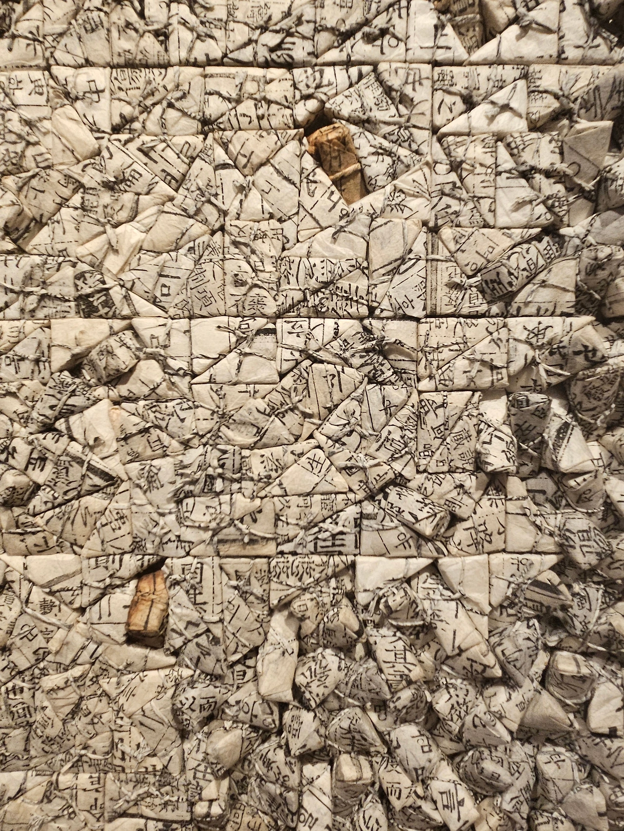 수 천 개의 약재 봉투 모양의 삼각형에 적힌 글씨는 그 누구도 온전히 해독하기 불가능해 무의미화 되며 새로운 조형적 가치를 만든다. 이는 기존의 서사가 새로운 맥락에서 탈영토화 되며 다른 가치로 재창출되며 다원화되는 인류 역사의 발전 과정과도 닮아있다.