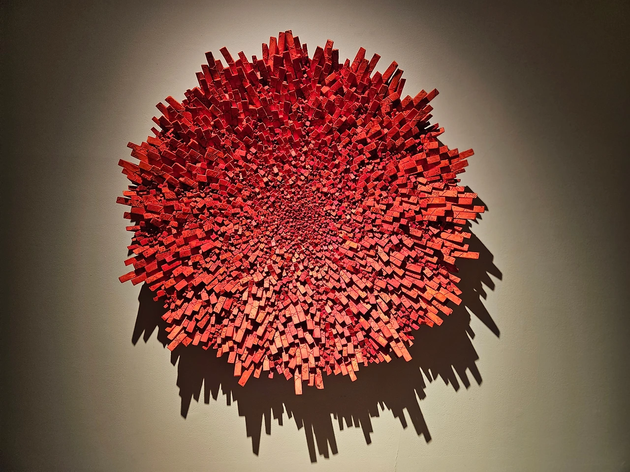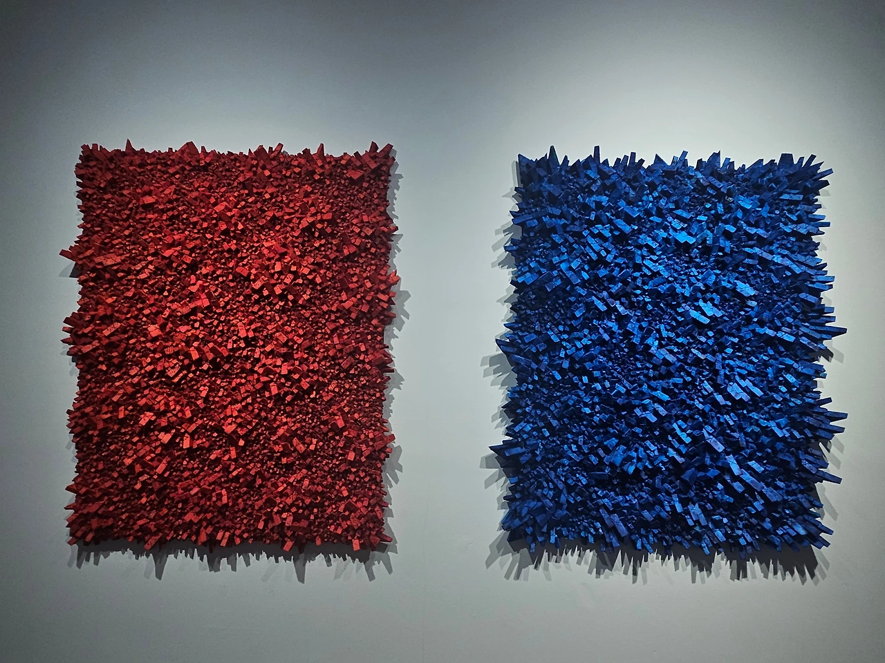강한 조명에 의한 그림자 효과도 조각의 일부분으로 수용한다. 관람객은 작품 앞에서 정적이면서도 강렬한 색감이 뿜어내는 에너지와 대형 설치 작업에서 압도감마저 느낀다.
