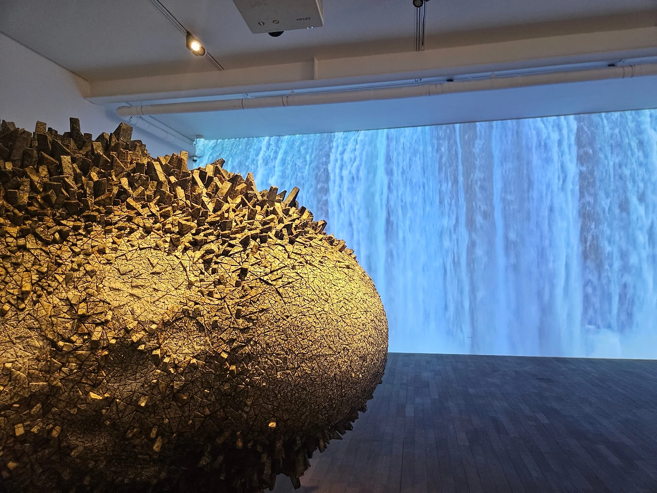 이번 전시에서는 가로 11m, 세로 4m의 벽에 드리운 폭포의 이미지를 통해 시각적으로 강렬하고 청량한 느낌을 준다. 그는 두 작업을 한 공간에 놓아 수만 년의 시간을 품은 자연과 인간이 만든 형상의 대비를 연출했다.