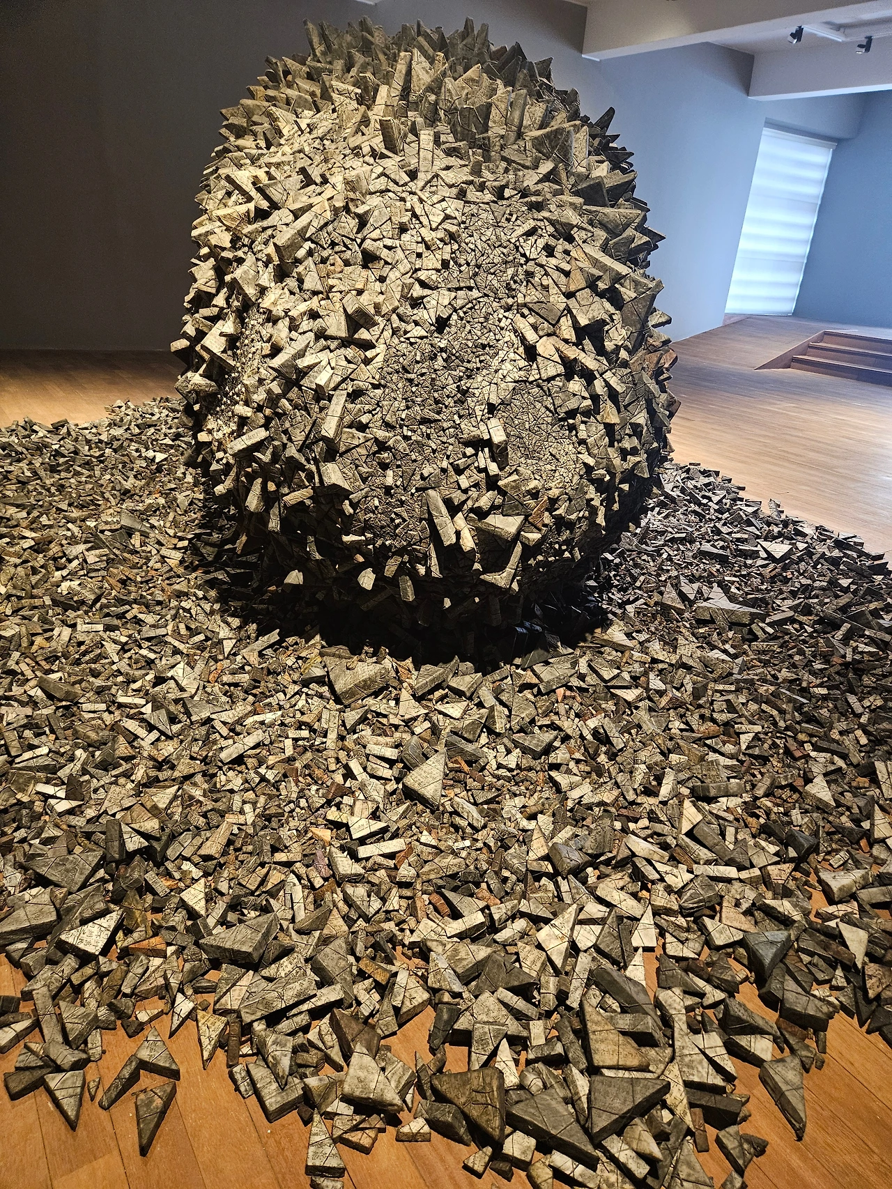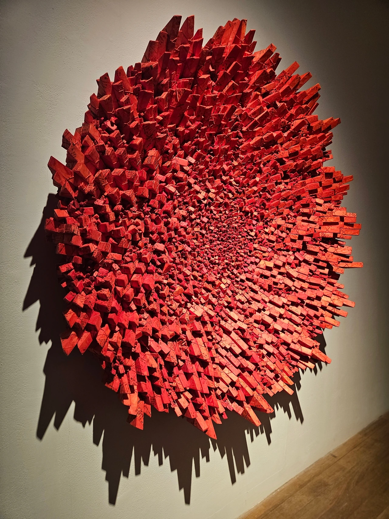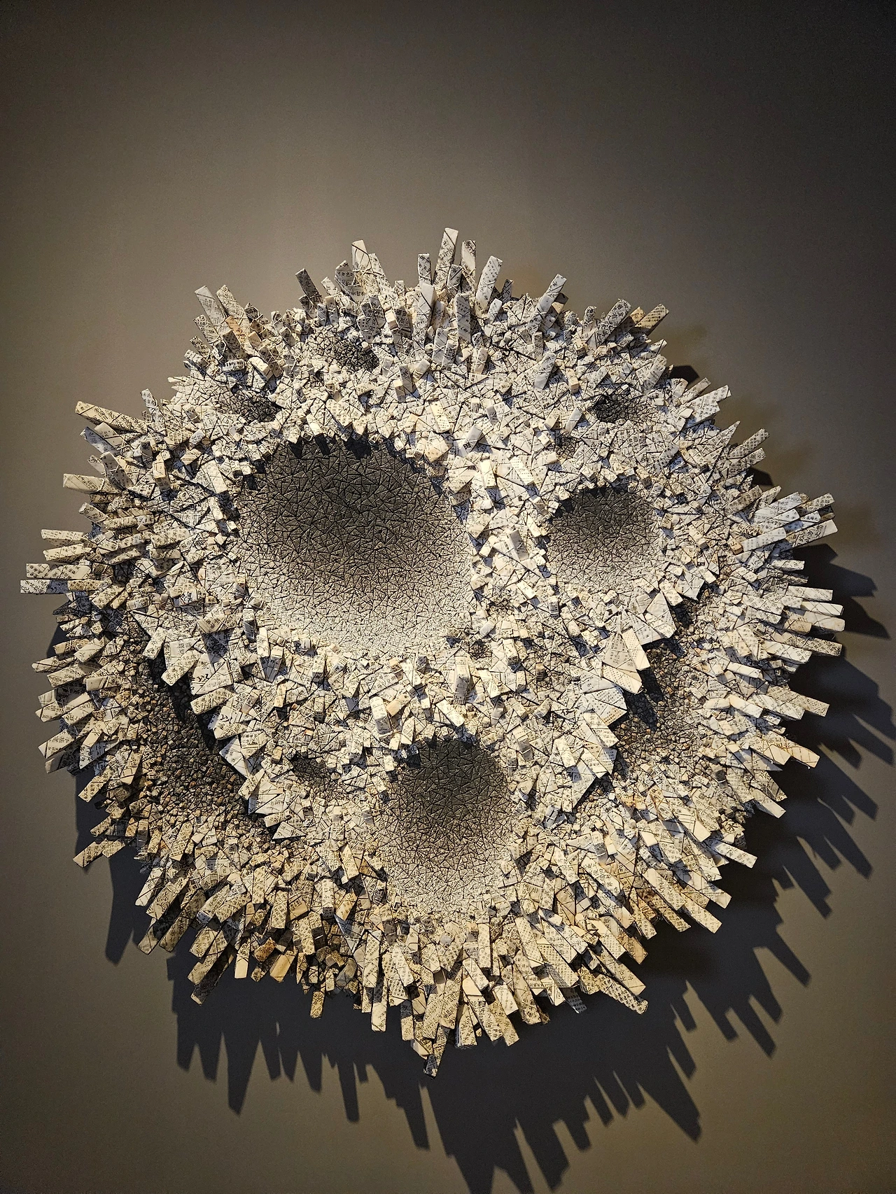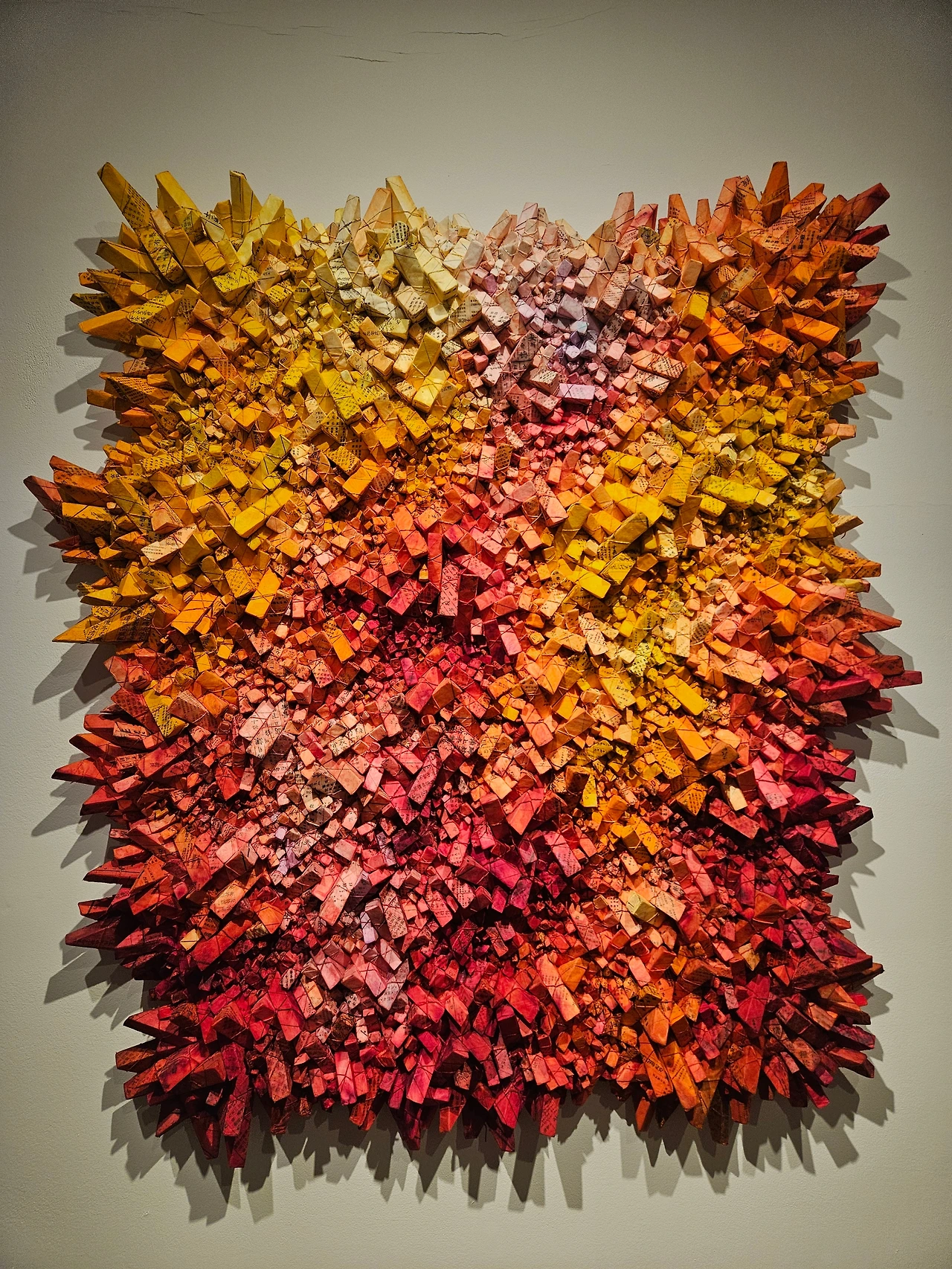 크기가 제각각인 삼각형 모듈이 긴밀하게 짜여 있는 그의 작품들은 종이로 만든 소프트 조각에 속한다. 노동집약적인 작업방식이지만 아이러니컬하게도 미니멀한 기하학 추상조각의 면모도 지닌다.