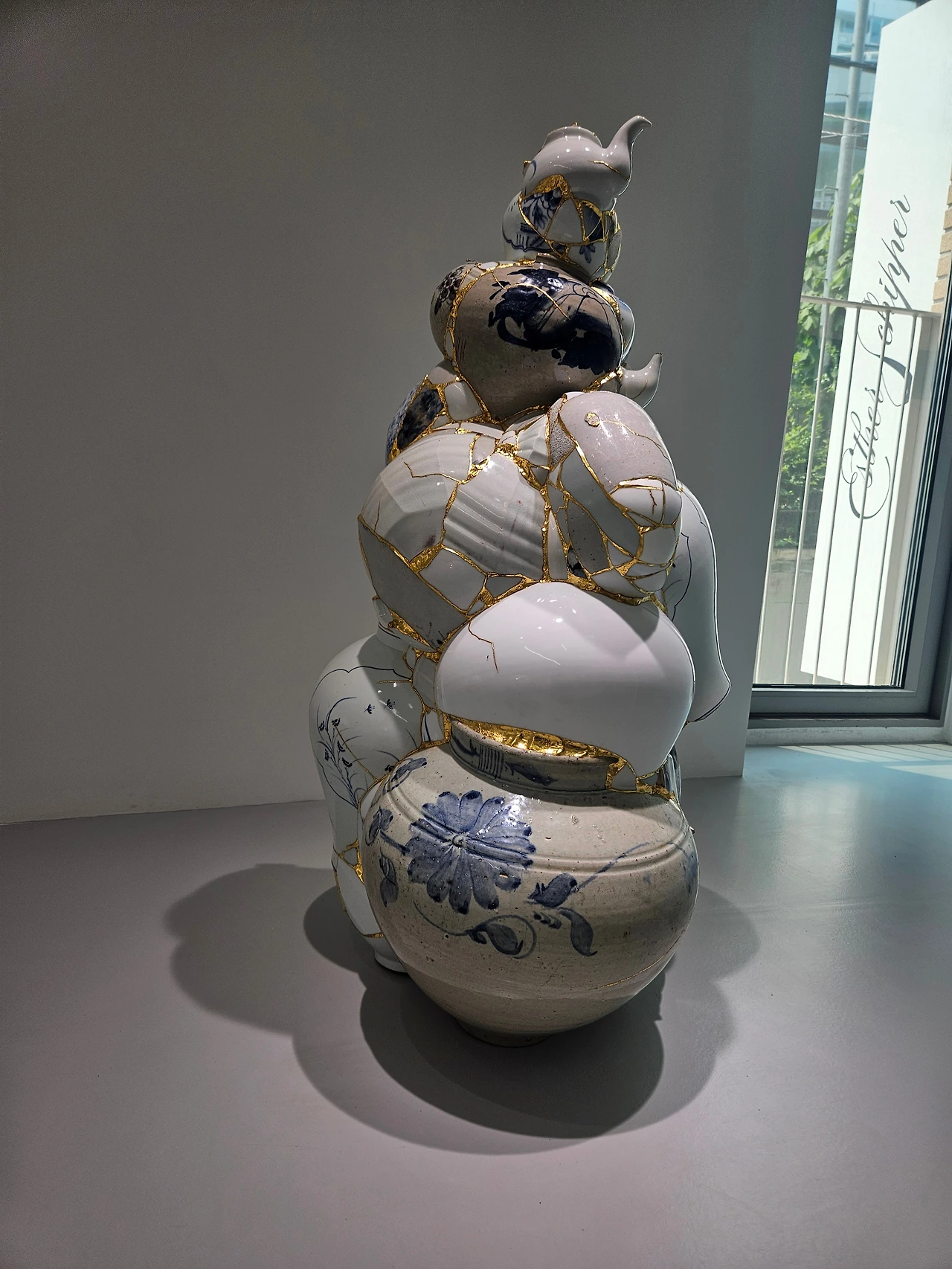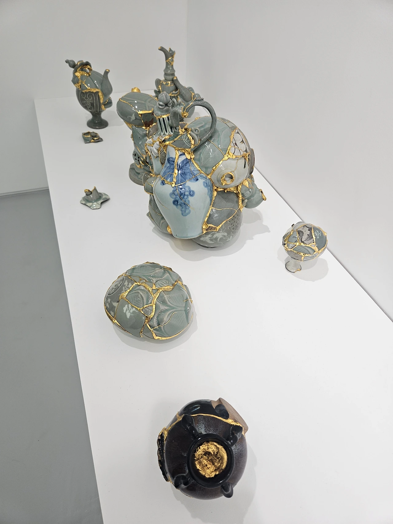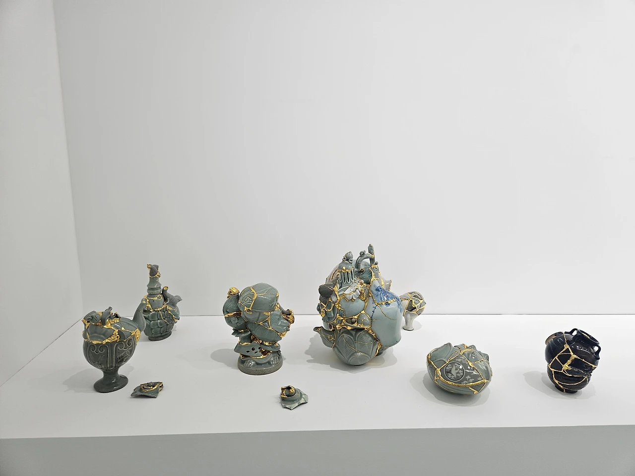 작가는 일본서 유래된 도자기 수선기법인 '킨츠키'를 이용했다. '금'이 간 부분을 '금(金)'으로 잇는 수공집약적 방식으로 레디메이드 조형물이 탄생했다.