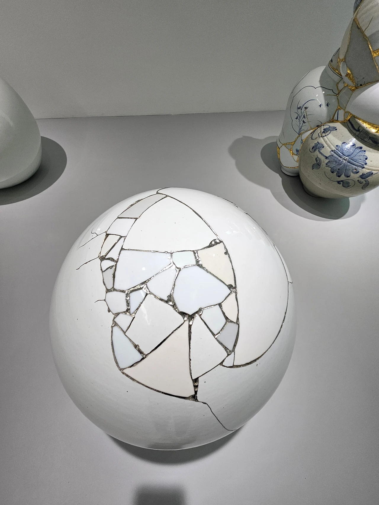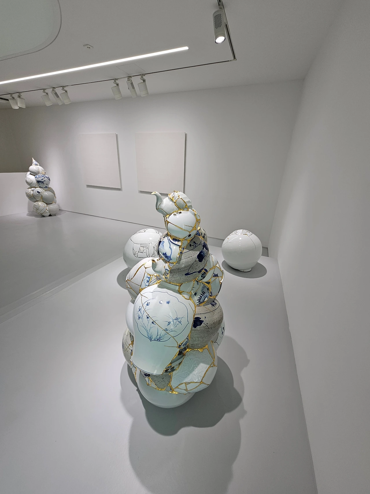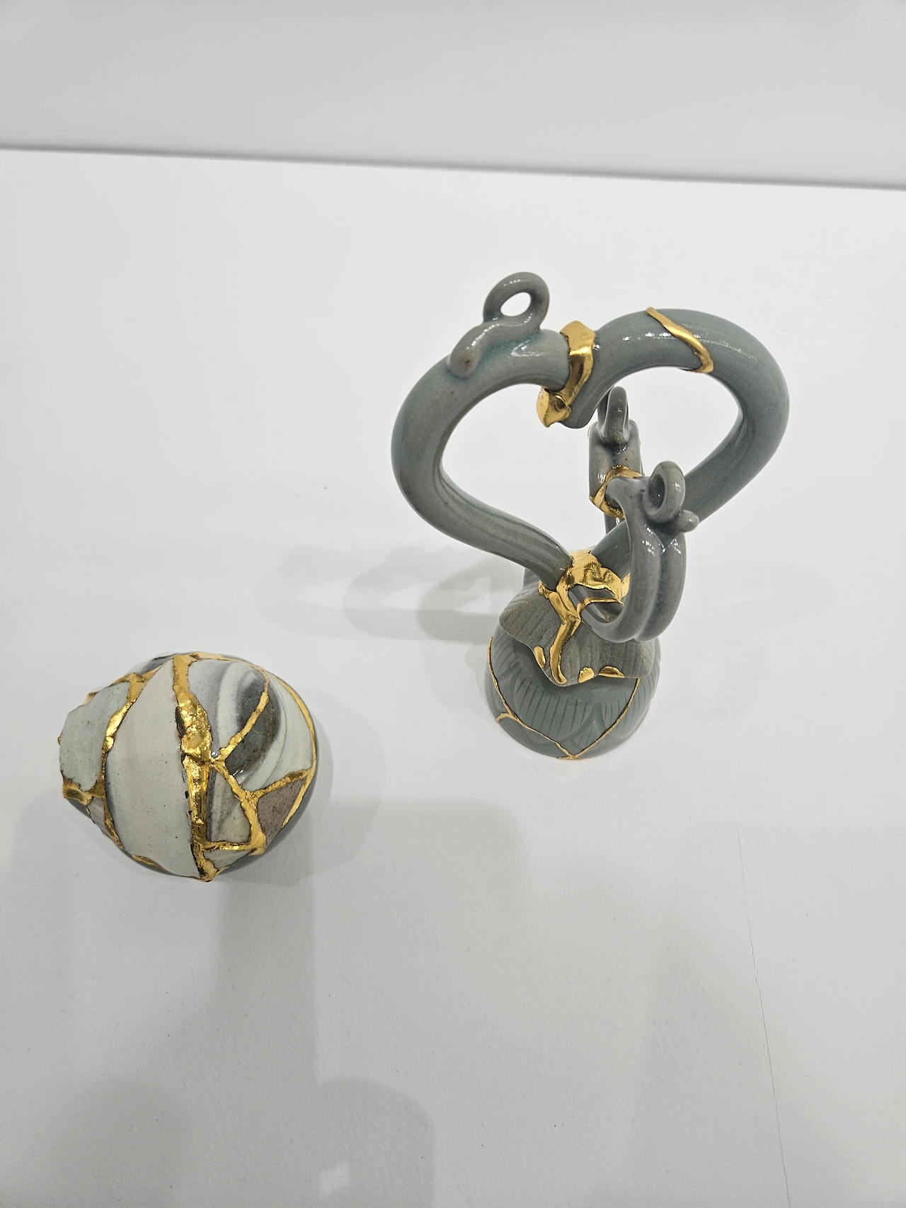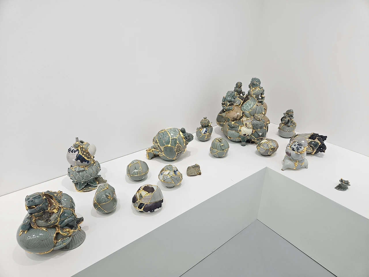 작가는 일본서 유래된 도자기 수선기법인 '킨츠키'를 이용했다. '금'이 간 부분을 '금(金)'으로 잇는 수공집약적 방식으로 레디메이드 조형물이 탄생했다.