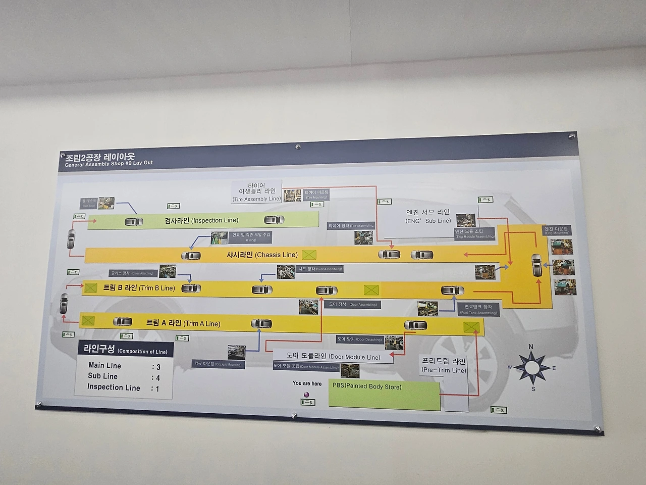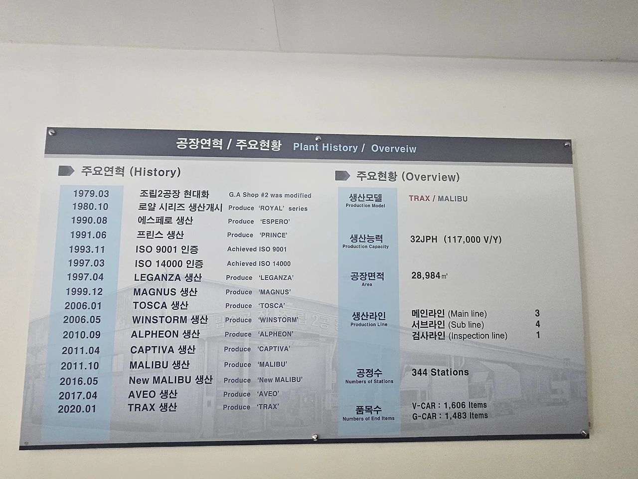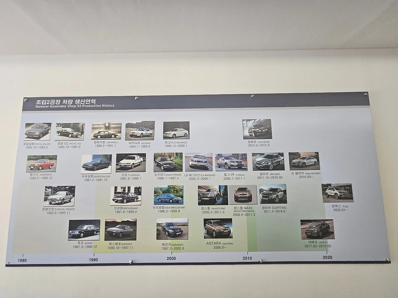 조립공장을 나서기 직전 복도에 지엠 대우 공장의 라인구성을 볼 수 있는 지도와 그동안 생산했던 차량에 관한 기록이 붙어 있었다. 저 많은 차종 중 내가 타 본 게 있으려나?