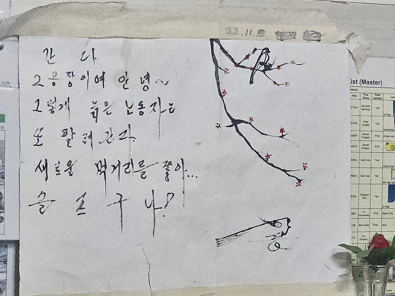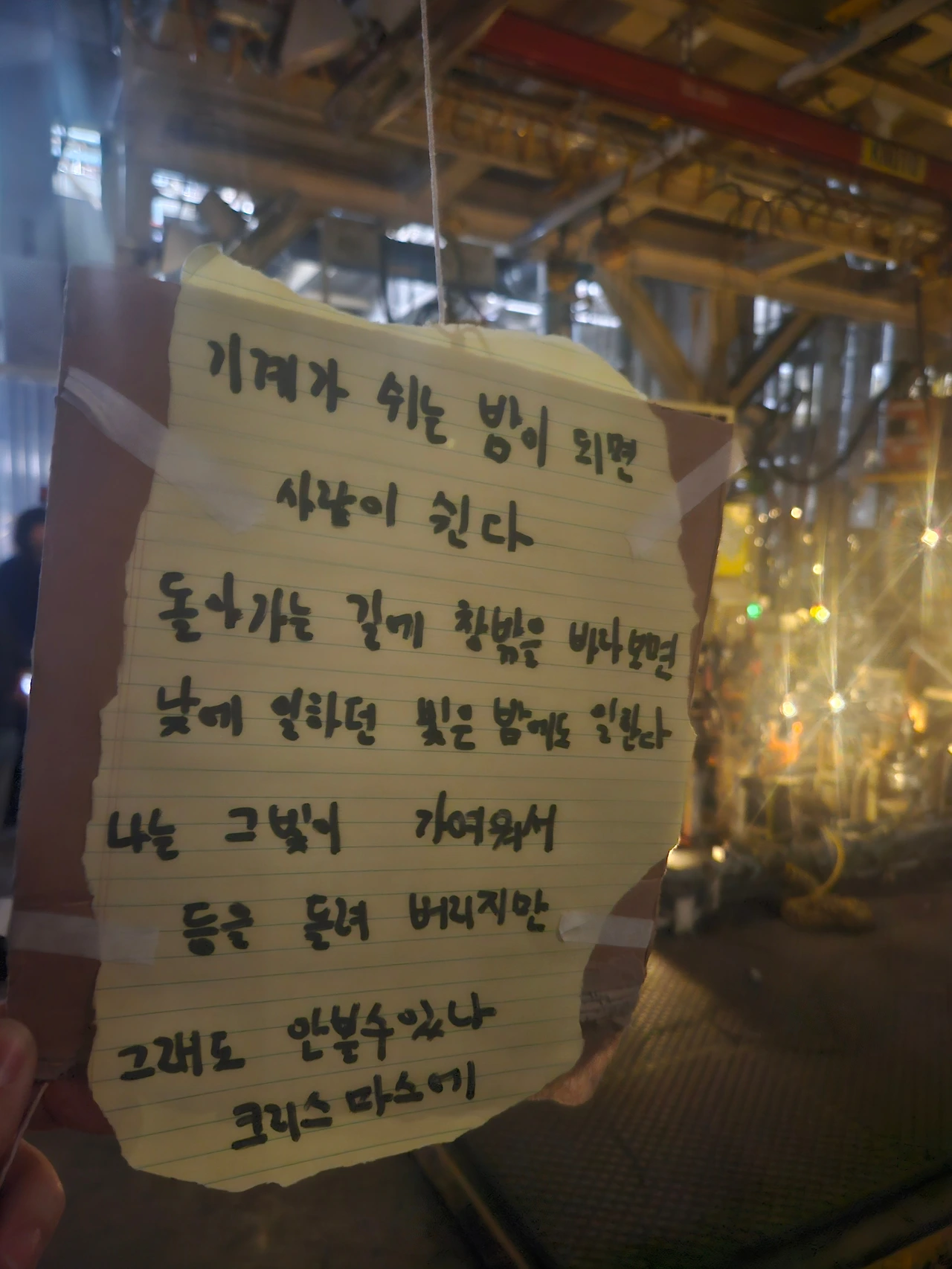 한때 노동자들의 휴게소였던 곳에 걸린 달력은 공장가동이 멈춘 2022년 11월에 멈춰 있었다. 그 옆에 노동자가 직접 그린 그림과 시가 걸려 있었는데 내용이 심금을 울렸다. 공장은 노조가 강력 반발하고 있지만 내년 상반기에 매각될 거라고 한다. 자동차 생산과 판매가 아닌 부동산 매각으로 수익을 창출하려는 움직임이 있어왔지만 부디 새로운 주인을 만나 계속 자동차가 생산되는 공간으로 남아있기를 간절히 바라며 부평을 떠났다.