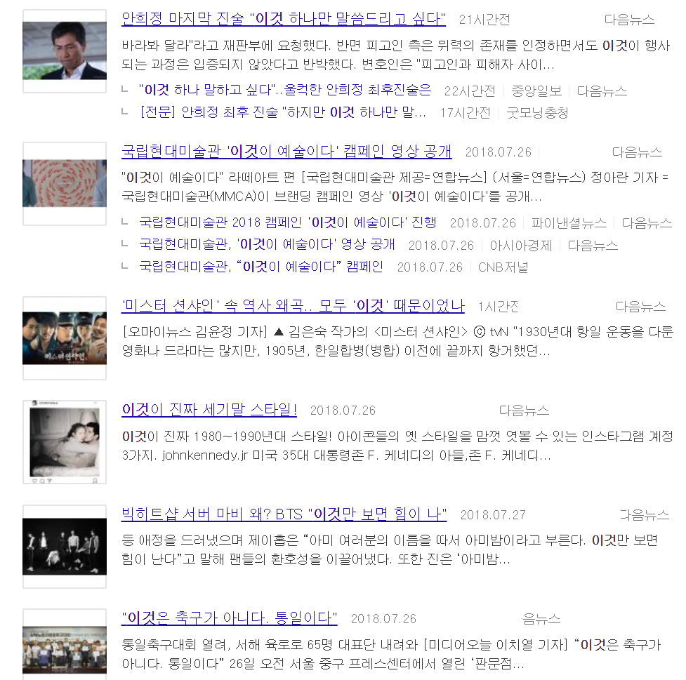 지금은 어떨까? 당장 다음 뉴스탭에서 '이것'을 검색한 결과다. 여섯 개의 기사 중 '이것'이 무엇인지 명확하게 표현된 건 두 개 밖에 없다. 그나마 하나는 사진 뉴스라고 하면 세 개. 절반에 가까운 인터넷 뉴스가, 이제는 '시간이 흘러 넘치는 나그네'를 위한 도구로 전락했다.
