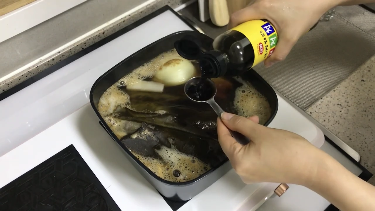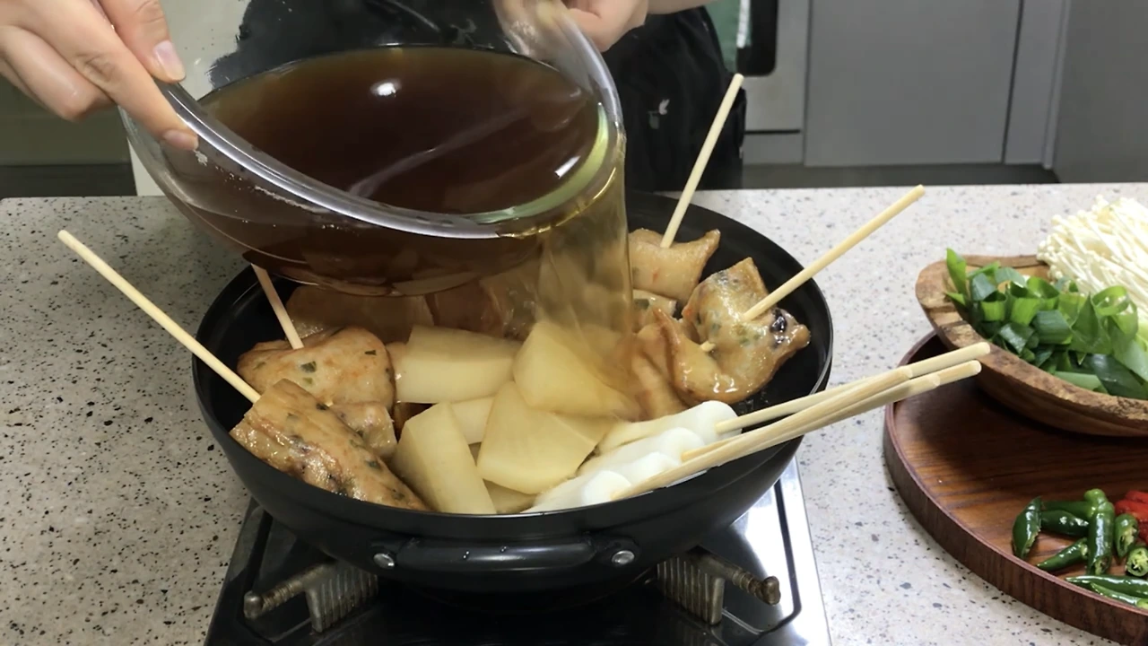 육수를 거름망에 걸러 냄비에 꼬지 넣고 육수 붓고