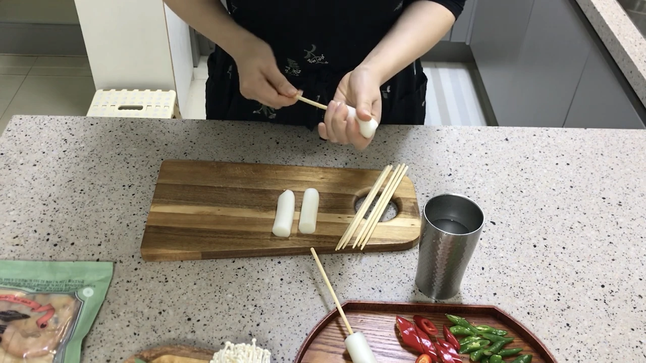 가래떡은 꼬지를 물에 살짝 담가 꽂으면 더 쉽게 꽂아져요. 굳은 떡은 밥솥에 넣어 말랑하게 만들어 꽂아요.
