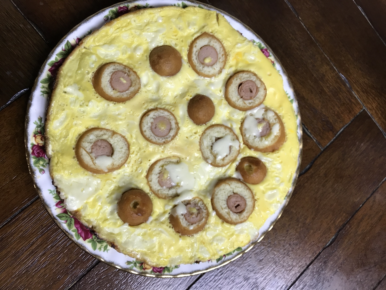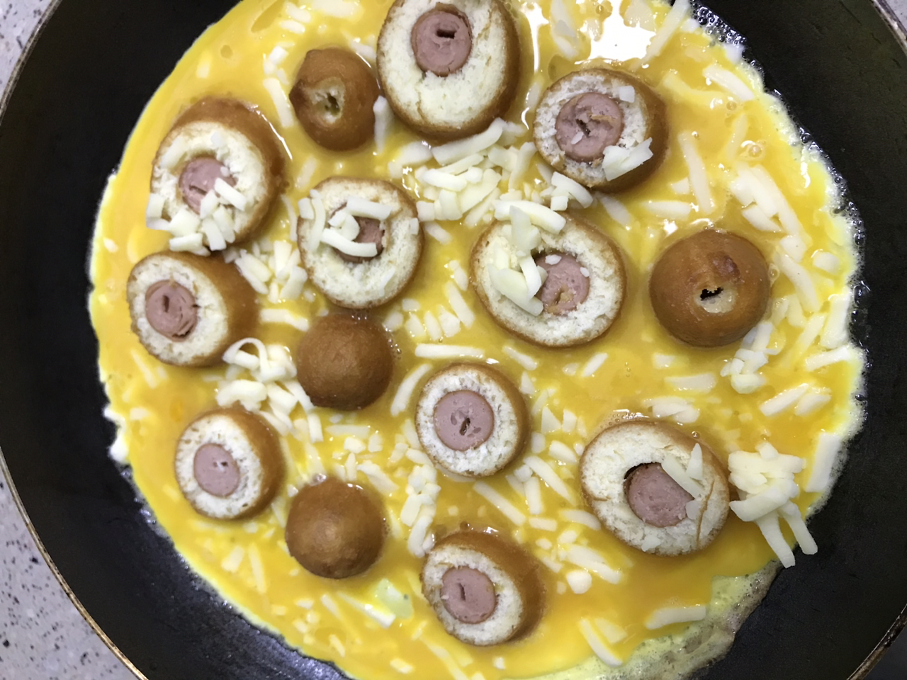 달걀 작은 사이즈 6개, 핫도그 2개, 피자치즈, 달걀 풀어 소금 간 하고 재료 올리고 익히면 끝.