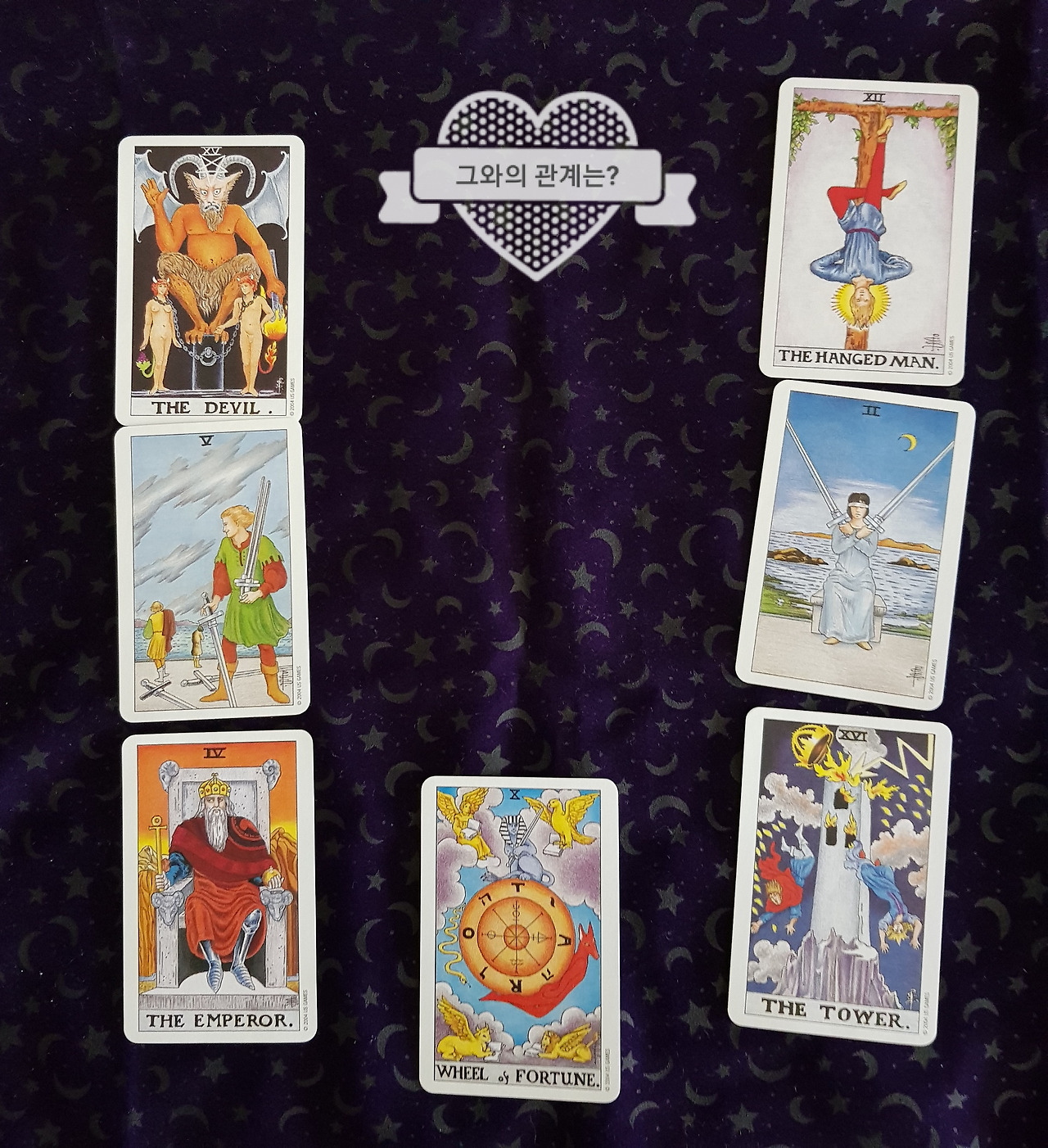 그리고 약식 관계 스프레드 7장의 카드를 뽑았습니다.