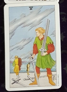타로 : 그녀가 그렇게 생각하는 이유는 '나'님의 마음 때문이겠죠. '나'님의 마음을 볼까요?이 카드 (5번 검)를 보세요. 왼쪽에 등을 돌리고 걸어가는 사람 느낌이 어떤가요?