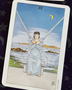 타로 : 그녀는 '나'님의 마음이 오락가락하고 있다고 생각한다고 나오네요. 이 카드 (2번 검 카드)를 보세요. 그녀가 생각하는 '나'님은 어느 날은 믿음이 가고, 어떤 날은 짜능 내는 사람일 수 있어요.
