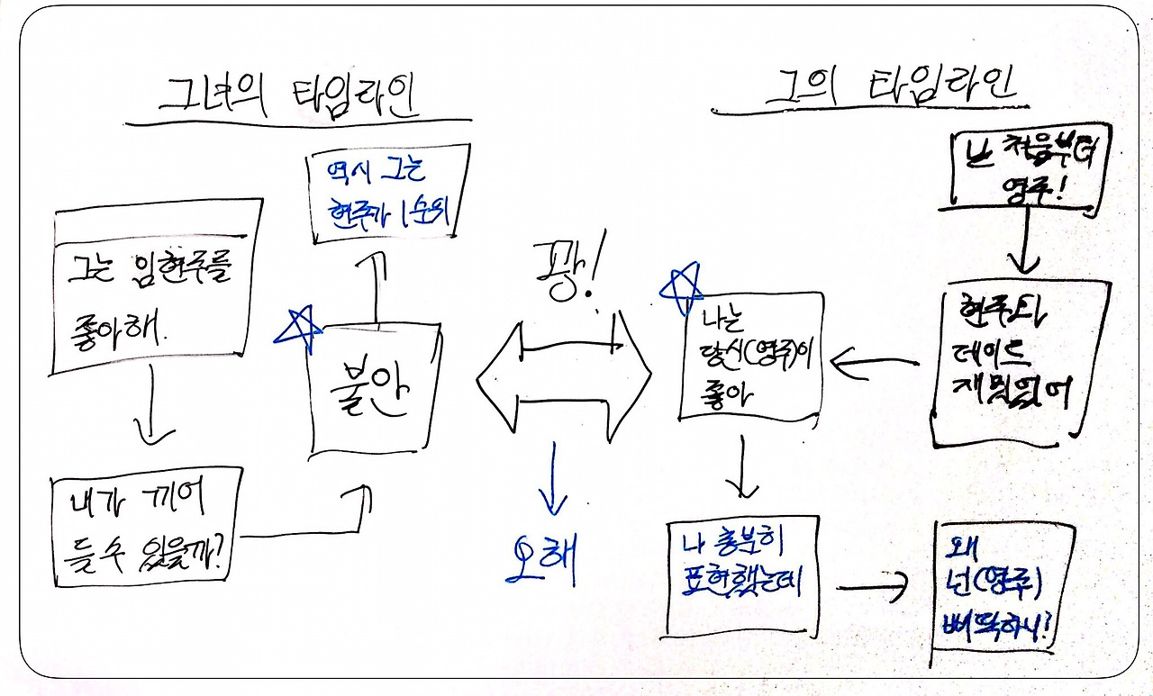 그렇다면, 이 오해의 원인은 오영주에게 있을까요? 김현우에게 있을까요? 나는 두 명을 둘러싼 상황과 표현 방식이 오해를 만들어냈다고 생각해요.
