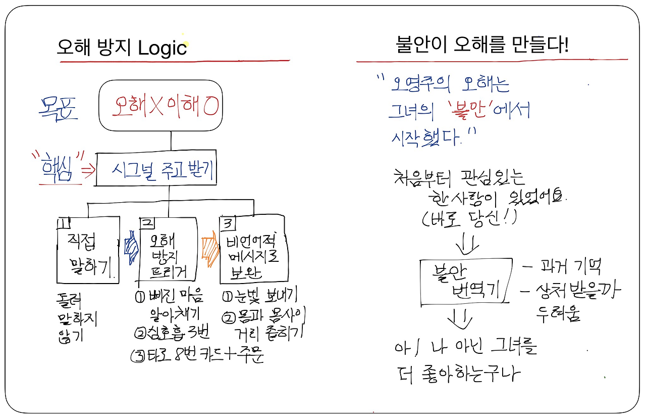 오해를 불러 일으키는 김현우 만의 대화 습관이 있습니다. 중요한 말을 하는 순간에도 상대 눈을 보지 않아요. 게다가 그는 주어를 거의 말하지 않습니다. 그러다보니 그의 메시지는 상대에게 다른 메시지로 읽힐 수 있어요.
