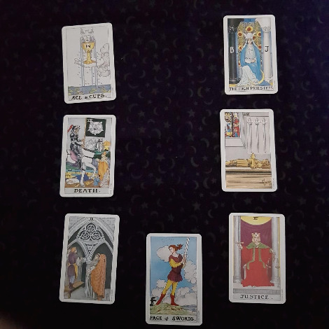 왼쪽 3장은 내가 생각하는 관계, 오른쪽 3장은 그녀가 생각하는 관계를 보여준다고 합니다. 내가 봐도 좋은 의미를 가진 카드는 없어보입니다.
