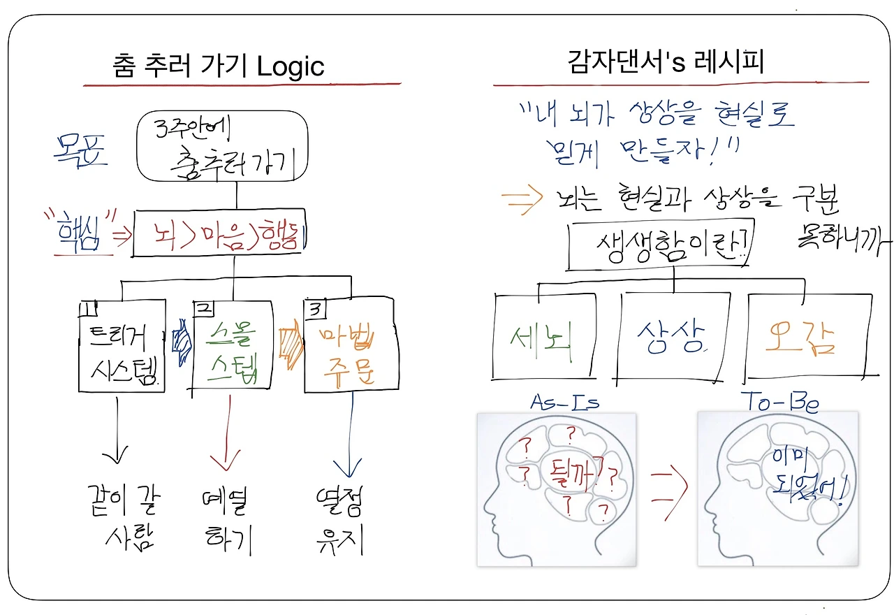 나는 매일 아침 8시 25분마다 노트에 '왜 나는 춤 추러 갔다오면 이렇게 삶이 재밌어지는 걸까?'라는 마법주문을 쓰려고 합니다. 이 마법주문을 사용하는 이유는 간단해요. 이 주문을 외울 때 마다, 내 뇌는 내가 춤을 춘 상황을 상상하게 되요. 그리고, 뇌 시스템은 이 상상을 현실로 만들 방법을 찾기 위한 백그라운드 작업을 합니다. 그러다 보면, 뇌 시스템의 명령을 받은 내 몸은 춤과 관련된 행동을 하게 됩니다. 이렇게 춤 추기라는 목표에 한발 한발 다가가는 셈입니다.