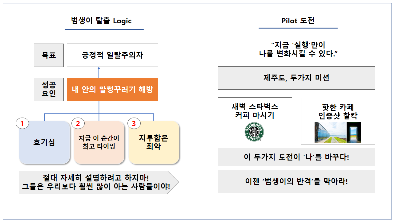 ㅇ 나는 이 비법을 실행하기 위해 제주도에 가서, 두가지 미션을 완수합니다. 그렇게 나는 '일탈주의자'로 변신합니다.