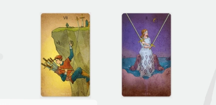 나 : 음.. 타로 카드 2장을 뽑으세요. 첫장은 그 사람을 생각하며, 둘째장은 자기 자신을 생각하며...