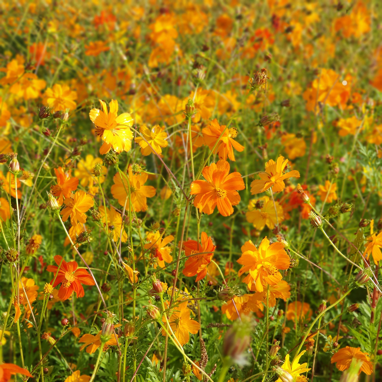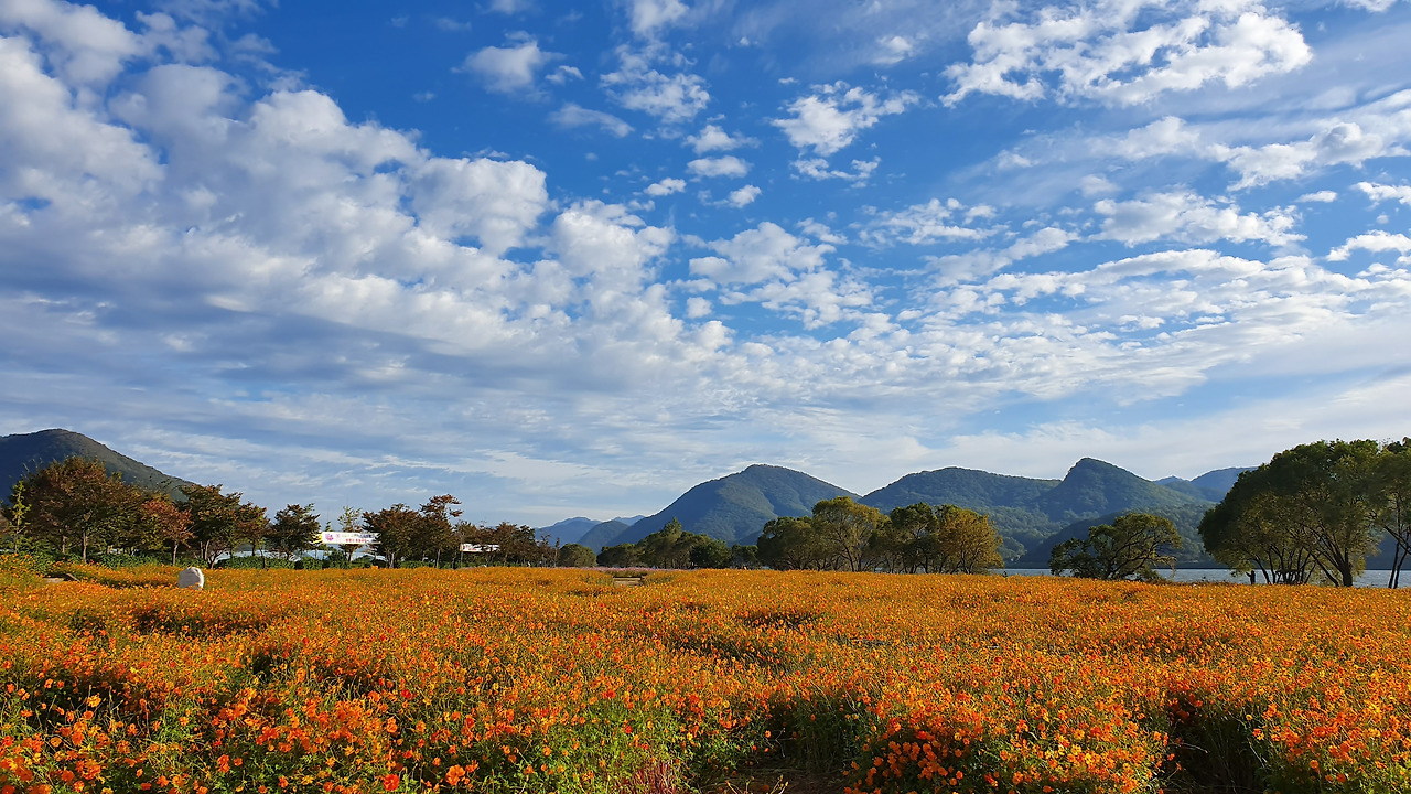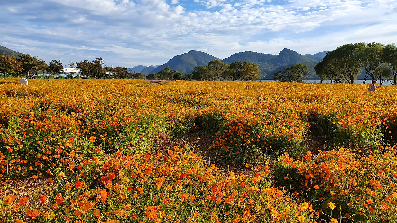 아침에 부지런을 떨어서 '황색 코스모스'가 유명하다는 양평 물의 정원에 갔습니다.