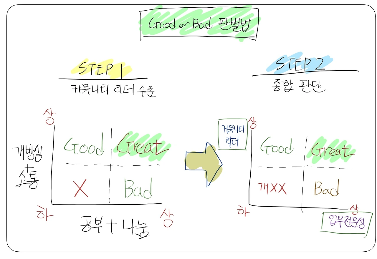 그러나,이제는기준을더높여야합니다. 회사 구성원의 미래와 조직의 발전을 위해서는 업무전문성보다 '개소공나'라는 커뮤니티 리더 역량을 더 높게 봐야 합니다.