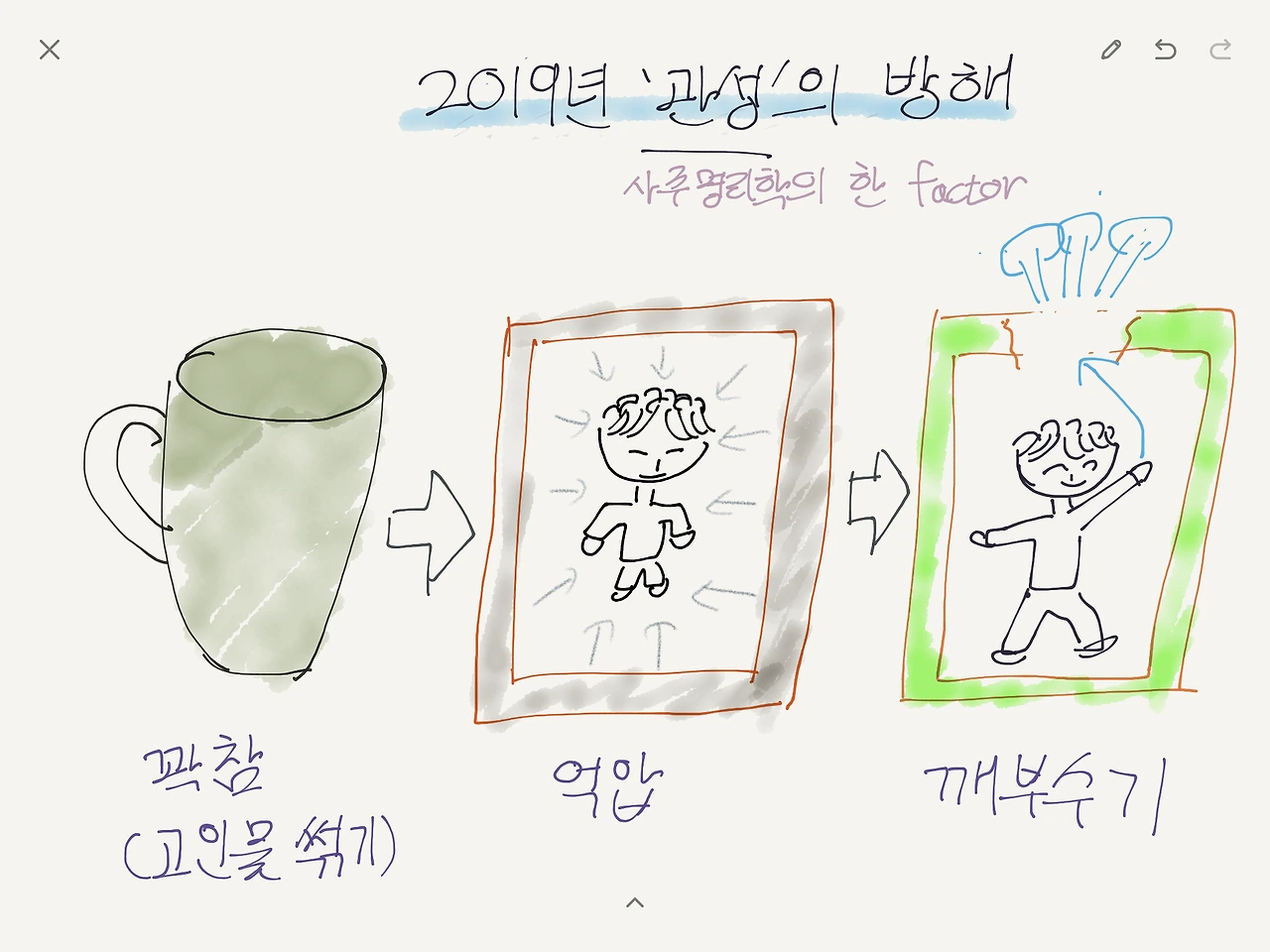 [관성이 나를 방해하는 logic] - 내가 좋아하는 것들을 계속 한다. - 그것이 너무 커진다. - 그것이 나에게 재미를 주는 게 아니라 '억압'이 된다. - 그것에 벗어나는 것은 모두 나쁜 것이 된다. - 그것을 버리지 않으면 나는 꼰대가 된다.