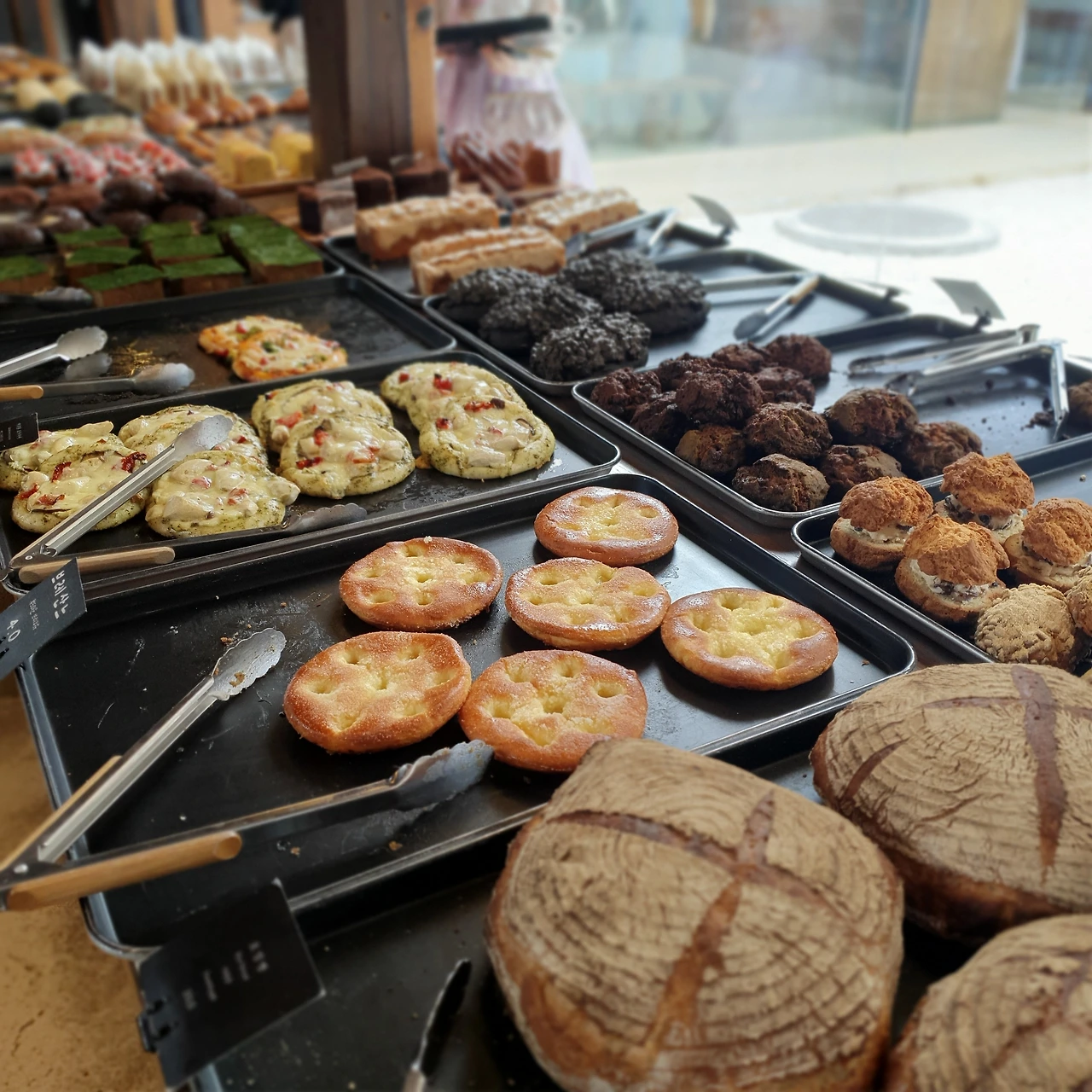 나는 앙버터스콘을 골랐다. 내 최애 빵은 앙버터니까... 먹고 싶은 빵이 너무 많았다. 점심을 방금 먹었음에도 칠리 소시지빵이 왜그리 맛나게 보이는지 ㅎㅎ. 그리고, 팡도르라고 하는 눈덮인 히말라야산처럼 생긴 빵도 처음 많났다. 그리고, 그 옆에는 딸기바라기라는 크림빵도 있었다. 다 먹고 싶었다.