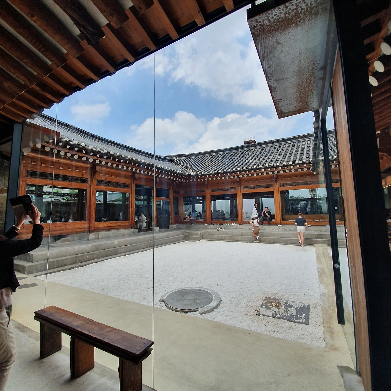 그리고, 여기 구조가 ㅁ자로 한옥 건물이 있고, 가운데 정말 넓은 중앙정원이 있다. 이 중정 때문에 너무 마음이 편안했다. 그 중정에서 기와집 너머 파아란 하늘을 올려다보는데 마음 속에서 꺼멓게 쌓여있던 회사 응어리들이 싹 내려가는 느낌이다.