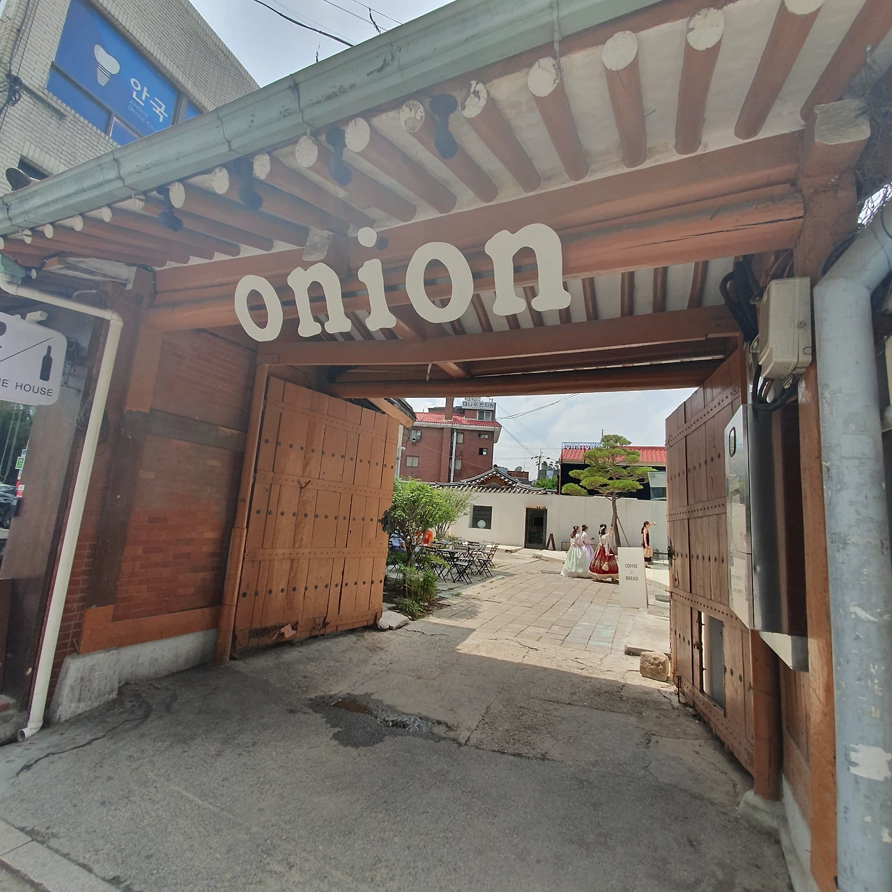 H가 선택한 점심 장소는 안국역 근처 식당이고, 밥을 먹고 신상 핫한 베이커리 카페가 있다며 서둘러 갔다. 바로 그곳은 '어니언 안국'. "우와~~~~" 나는 그곳에 들어가는 순간 입이 쩍 벌어졌다. 카페라고는 스벅과 이디야 밖에 모르고, 베이커리라고 하면 파바와 동네 빵집 밖에 모르는 나에게 '어니언 안국'은 파라다이스였다. 이렇게 이쁘고 맛난 빵들이 많고, 이렇게 큰 한옥 건물이라니...