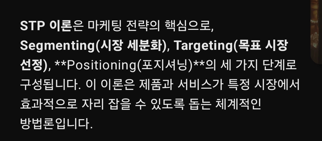 그러면, AI 선생님이 STP가 어떻고 전략적 차별화 이론 등 쫘악 말해 준다. 그러면, 그거대로 따라해 보면 최소 80점짜리 보고서는 쓸 수 있다.