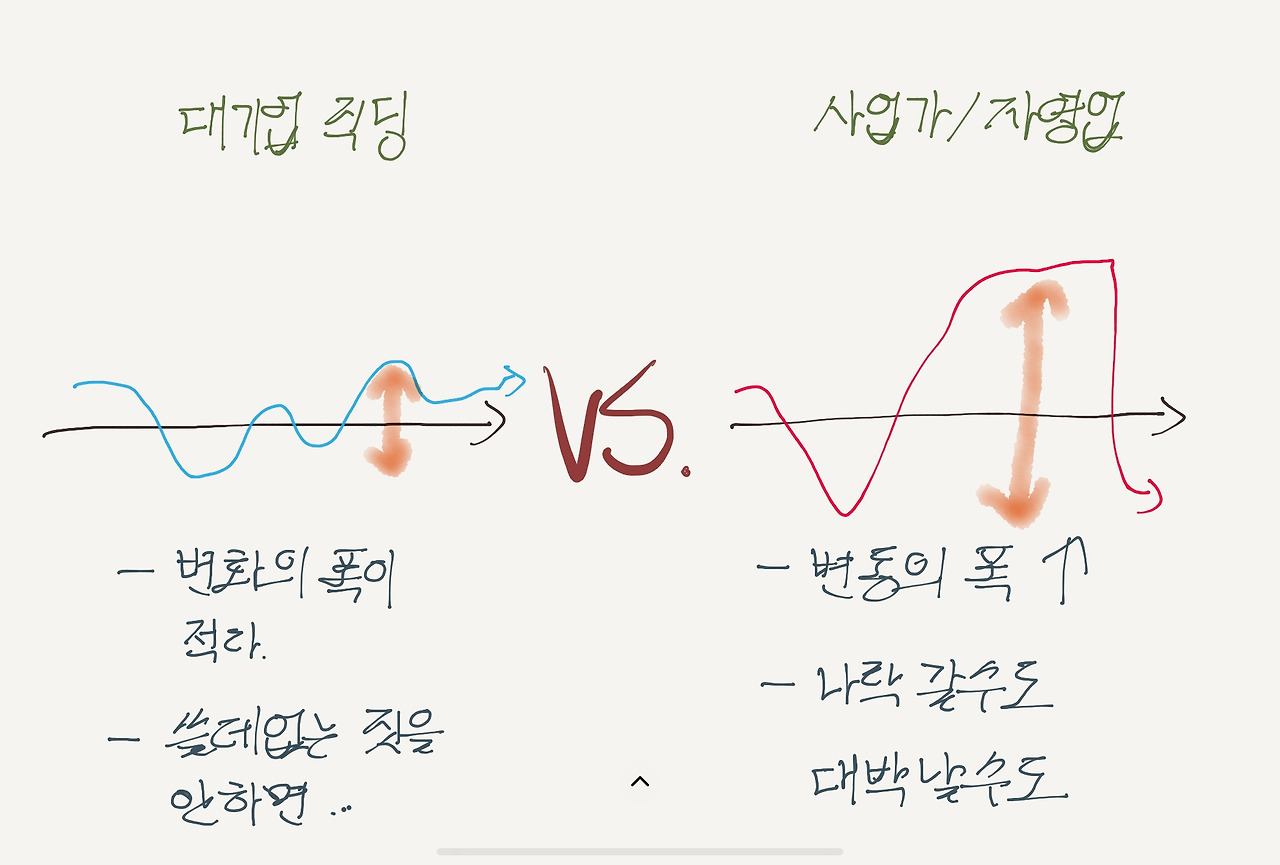 대기업 직딩의 삶은 사업 또는 자영업을 하는 사람들과 비교했을 때, 상대적으로 평탄하다. 여기서 평탄하다는 의미는 좋을 때와 나쁠 때가 특별히 없다라는 의미라기 보다는 변독폭이 작다는 의미다.