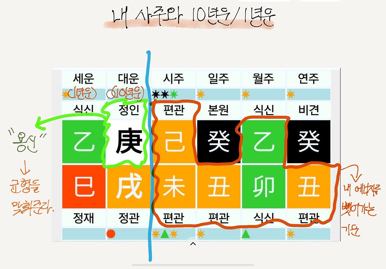 나를 예로 들면, 내가 타고난 사주에는 '식상-재성-관성'이라는 내 에너지를 뺏어가는 기운이 많다. 그래서, 균형을 위해서는 나에게 에너지를 주는 기운인 '비겁-인성'이 필요하다. 바로 그것이 내 용신이다.