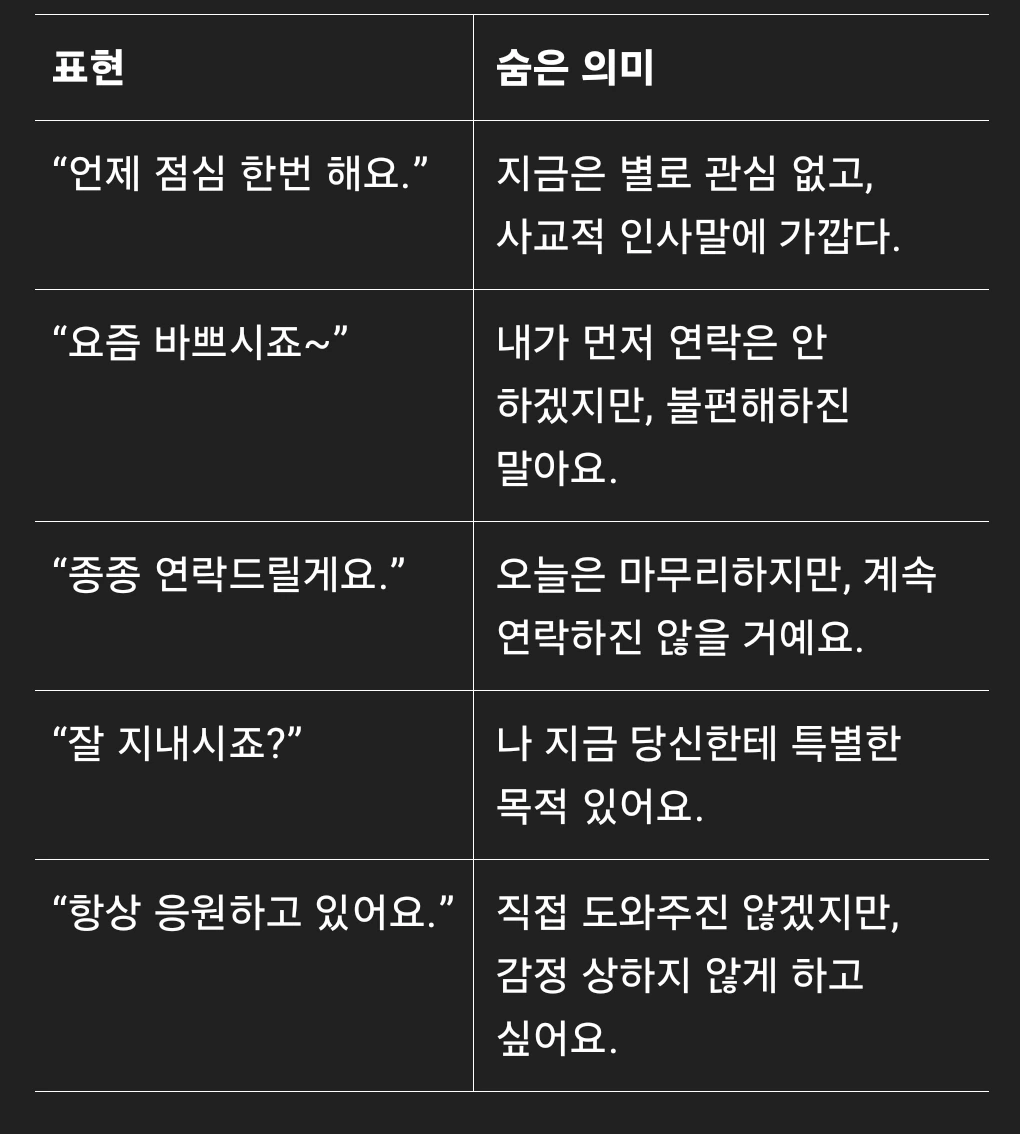 이런 대화를 나누고, 다음에 그 옥순에게 커피 마시자는 제안을 할까 고민했지만 하지 않았다. 왜냐하면, 저 말이 진심인지 확신이 서지 않았기 때문이다. 직징 예의어 판단 기준인 반복성과 행동 관점에서 생각해 보자. 옥순은 매번 저렇게 다정하게 말을 한다. 여러번 반복적으로.. 그리고, 한번도 그 말을 행동으로 보여준 적이 없다. 즉, 그냥 모든 사람에게 친절한 직딩 예의어였을 뿐이다.