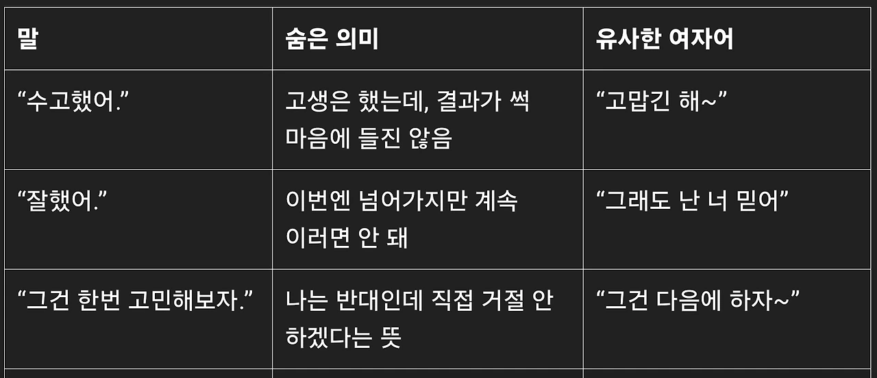 직딩 예의어란 회사에서의 인간관계를 망치지 않으면서 감정을 숨기는 정중한 회피 언어를 의미해. 좀 과장해서 말하면, 회사에서 사용하는 진심 2%짜리 거짓말이야.