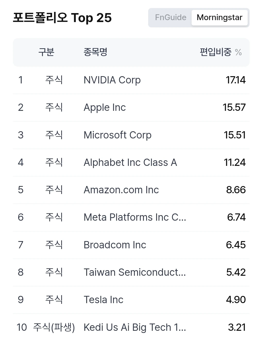 * 참고 : ETF 구성하는 주식은 아래처럼 AI로 핫한 기업들이야. AI 혁명 시대에 100% 오르는 기업들이지.