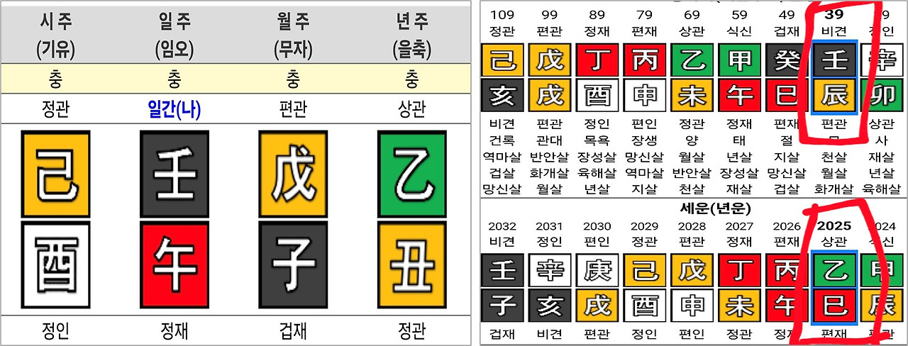 연주 : 을축, 월주 : 무자, 일주 : 임오, 시주 : 기유 / 39세 임진 대운, 2025년 을사 세운