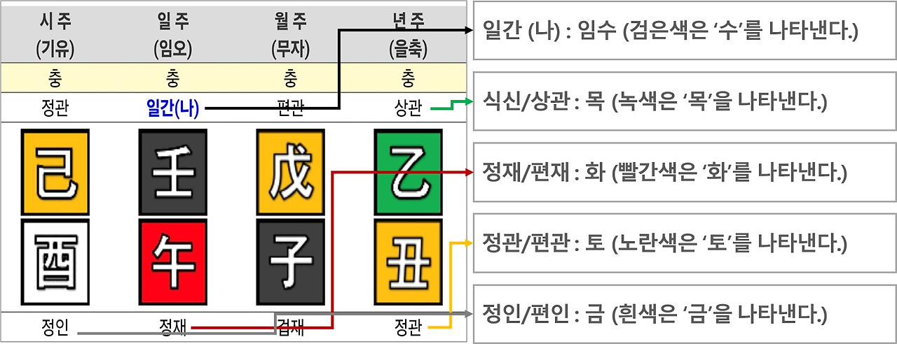 ㅇ 일간 : 임수, 식신/상관 : 목, 정재/편재 : 화, 정관/편관 : 토, 정인/편인 : 금