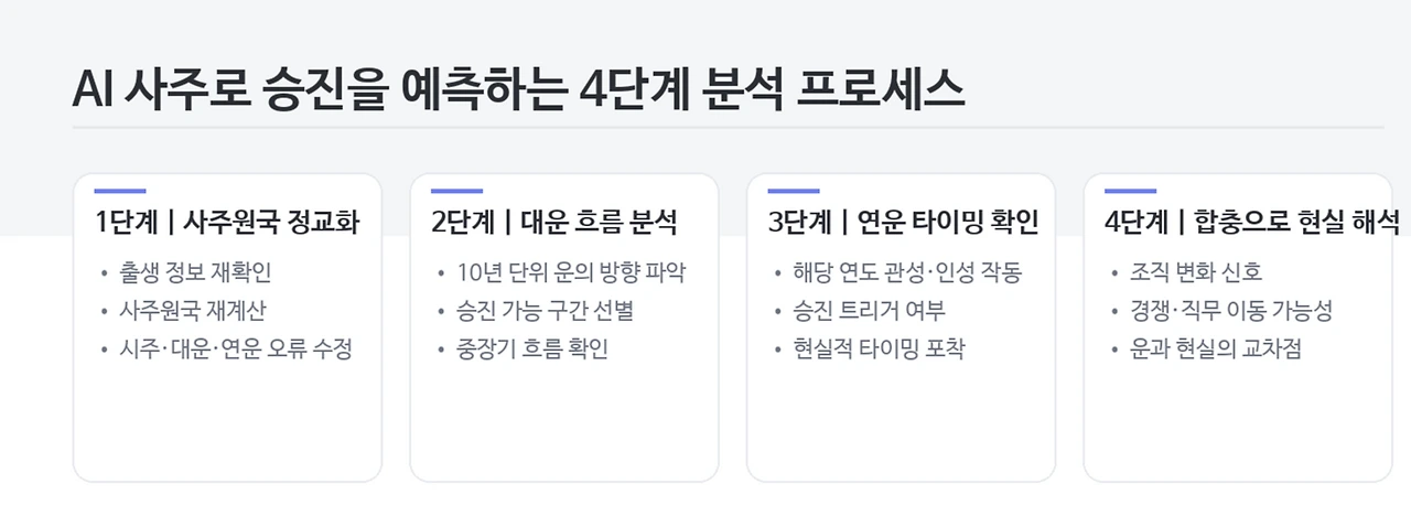 그리고, AI로 사주 분석하는 이유는 결과를 예측하기 위해서가 아니다. 내가 원하는 결과를 만들기 위해 지금 무엇을 해야하는지 모니터링하기 위해서다. AI 사주는 방향을 보여주는 도구이고, 조직의 변화, 상사와의 관계, 내 실력, 타이밍 등을 파악하기 좋은 도구다. 물론 추상적이기는 하지만 말이다.