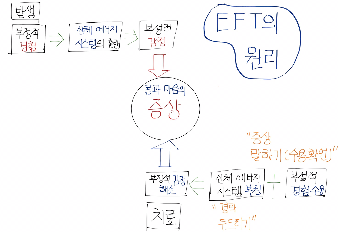 그런데, EFT가 무엇이냐고요? EFT는 Emotional Freedom Techniques의 약자입니다. 어렵지요? 쉽게 얘기하면, '증상과 관련된 말을 소리 내어 말하면서 몸의 경혈을 침 대신 손가락으로 두드리는 치료법'입니다. 아래에 체험방법을 소개했으니 해보세요. 단 5분이면 됩니다.
