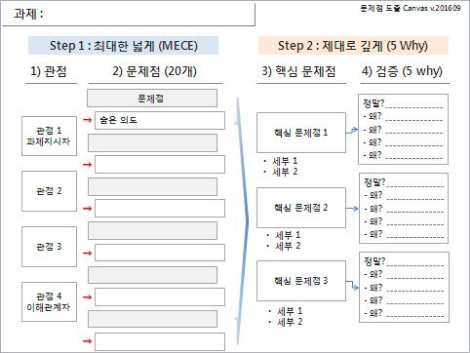 그러면, 아래 양식으로 문제점을 정리해 보세요. 핵심은 '넓고 깊게'.. 잊지 않고 있죠?