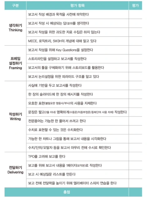 지금 우리 냉정히 내 보고서를 평가해 보면 어떨까요? 100점 만점에 몇점이라고 생각하시나요? 점수 계산이 어려우면 다음 표를 보고 평가해 보세요. 항목별 5점 만점으로 평가하여, 80점 이상 이면 우수입니다.