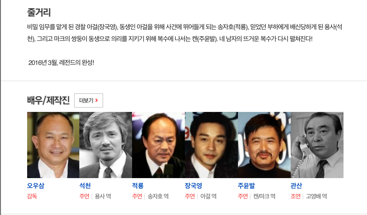 아래 '석천, 적룡, 장국영, 주윤발'은 정의의 편에서 의리를 위해 복수를 하는 인물들..