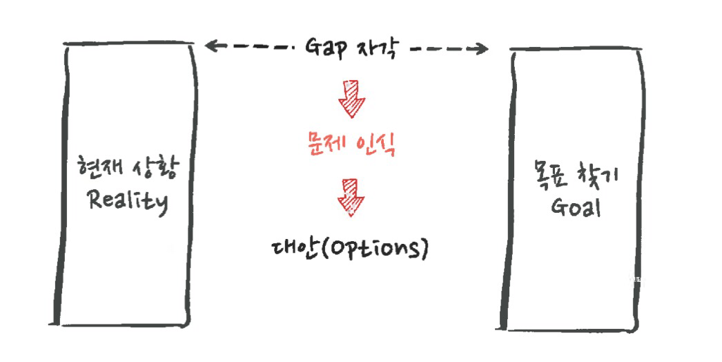 그렇게 코칭 주제를 정하고 그 다음 단계인 Reality (현 문제점 진단)와 Option (대안도출) 단계로 진행했습니다.