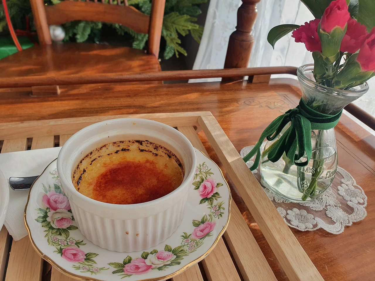 앤틱한 분위기, 크림브륄레, 꿀차, 꽃, 나무 책상, 햇빛, 공책, 펜, 책
