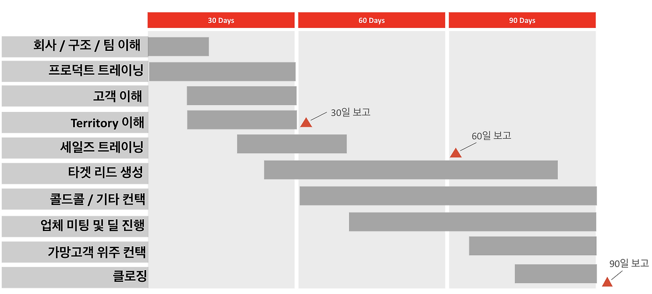 나의 30-60-90 Day plan의 일부. 특별히 독자들에게 공유합니다 :)업계 / 영업 용어가 다소 섞여있으나 그래프로 나타내면 위와 같다. 입사 전 이 같은 계획을 세울 때는 영업 기간(sales cycle)을 고려하지 못하여 90일 안에 두 개 법인을 수주할 것이라고 계산했었는데, 첫 수주를 한 건 입사 후 반년이 지나서였다. OTL 그래도 여기서 수주 빼고 얼추 비슷하게 갔으니 온보딩 성적이 나쁘지 않았다고 스스로 위로해본다.