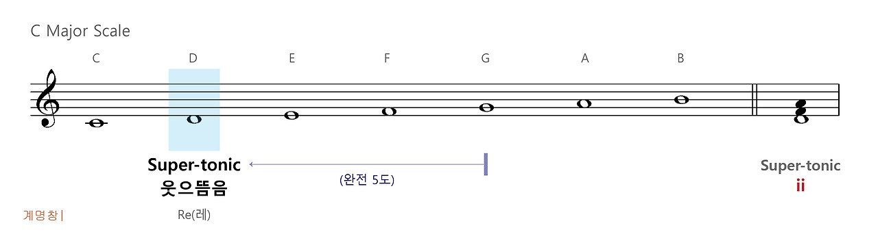 으뜸음 다음에 오는 윗 음으로 'Supertonic (웃으뜸음)'이라고 한다.