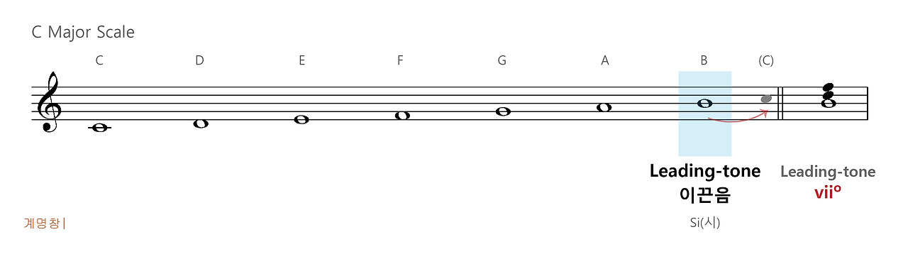 특히 화성에서 중요한 역할을 하는 Leading-tone은 딸림화음(V)의 3음으로, 반음인 '시-도'의 Tonic으로의 진행이 긴장-해결의 종지적 성격을 강하게 가질 수 있게 한다. 음계가 '도레미파솔라시-'에서 끝이 난다면, 다음 도를 외쳐야 할 것 같은 해결되지 않는 불안감이 아직 남아있다.