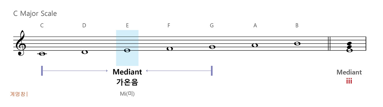 음계의 제3음으로 Tonic과 Dominant 사이, 가운데 위치하여 'Mediant (가온음)'라고 부른다. Tonic(도)-Mediant(미)-Dominant(솔)는 으뜸화음을 구성하는 근음-3음-5음이다.