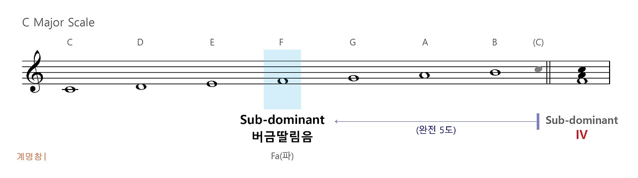 음계에서 나열된 순서로는 4번째 음이지만 Tonic을 중심으로 보았을 때 Dominant와 대칭점인, 즉 Tonic에서 '완전 5도 아래'의 음으로 'Sub-dominant (버금딸림음)'라는 이름이 붙는다.